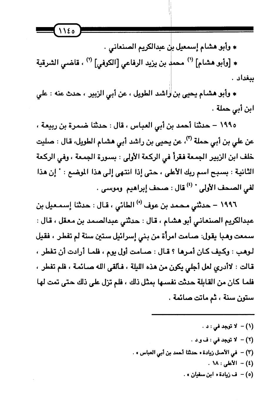 1996 - حَدَّثَنِي مُحَمَّدُ بْنُ عَوْفٍ الطَّائِيُّ، قَالَ: حَدَّثَنَا إِسْمَاعِيلُ بْنُ عَبْدِ الْكَرِيمِ الصَّنْعَانِيُّ أَبُو هِشَامٍ، قَالَ: حَدَّثَنِي عَبْدُ الصَّمَدِ بْنُ مَعْقِلٍ، قَالَ: سَمِعْتُ وَهْبًا، يَقُولُ: " §صَامَتِ امْرَأَةٌ مِنْ بَنِي إِسْرَائِيلَ سِتِّينَ سَنَةً لَمْ تُفْطِرْ، فَقِيلَ لِوَهْبٍ: وَكَيْفَ كَانَ أَمْرُهَا؟ قَالَ: صَامِتْ أَوَّلَ يَوْمٍ، فَلَمَّا أَرَادَتْ أَنْ تُفْطِرَ، قَالَتْ: لَا أَدْرِي لَعَلَّ أَجْلِي يَكُونُ مِنْ هَذِهِ اللَّيْلَةِ، فَأَلْقَى اللَّهَ صَائِمَةً، فَلَمْ تُفْطِرْ، فَلَمَّا كَانَ مِنَ الْقَابِلَةِ حَدَّثَتْ نَفْسَهَا بِمِثْلِ ذَلِكَ، فَلَمْ تَزَلْ عَلَى ذَلِكَ حَتَّى تَمَّتْ لَهَا سِتُّونَ سَنَةً، ثُمَّ مَاتَتْ صَائِمَةً " -[1146]- أَخْبَرَنِي أَحْمَدُ بْنُ شُعَيْبٍ قَالَ: أَنْبَأَ مُحَمَّدُ بْنُ بَشَّارٍ قَالَ: حَدَّثَنَا مُحَمَّدُ بْنُ جَعْفَرٍ قَالَ: حَدَّثَنَا شُعْبَةُ، عَنْ عَائِذِ بْنِ حَبِيبٍ أَبِي هِشَامٍ. وَأَخْبَرَنِي أَحْمَدُ بْنُ شُعَيْبٍ، قَالَ: أَنْبَأَ مُحَمَّدُ بْنُ يَزِيدَ الرَّوَّاسِ قَالَ: حَدَّثَنَا أَبُو هِشَامٍ عَبْدُ اللَّهِ بْنُ نُمَيْرٍ. أَخْبَرَنِي أَحْمَدُ بْنُ شُعَيْبٍ قَالَ: أَنْبَأَ مُحَمَّدُ بْنُ الْمُثَنَّى أَبُو مُوسَى قَالَ: حَدَّثَنَا أَبُو هِشَامٍ الْمُغِيرَةُ بْنُ سَلَمَةَ الْمَخْزُومِيُّ. وَأَخْبَرَنِي أَبُو عَبْدِ الرَّحْمَنِ، قَالَ: أَنْبَأَ عِصْمَةُ بْنُ الْفَضْلِ، قَالَ: حَدَّثَنَا أَصْرَمُ بْنُ حَوْشَبٍ أَبُو هِشَامٍ. حَدَّثَنَا الْعَبَّاسُ بْنُ مُحَمَّدٍ قَالَ: سَمِعْتُ يَحْيَى بْنَ مَعِينٍ يَقُولُ: حَدَّثَنَا وَكِيعٌ، عَنْ أَبِي هِشَامٍ الْأَحْوَلِ، عَنْ يَحْيَى بْن قَيْسِ، «أَنَّ ابْنَ عُمَرَ أَكَلَ لَحْمَ جَزُورٍ» ، قَالَ يَحْيَى: " أَبُو هِشَامٍ الْأَحْوَلُ هَذَا هُوَ الرَّبِيعُ بْنُ حَبِيبٍ أَخُو عَائِذِ بْنِ حَبِيبٍ. قَالَ: وَسَمِعْتُ يَحْيَى يَقُولُ: «مُغِيرَةُ الضَّبِّيُّ كُنْيَتُهُ أَبُو هِشَامٍ»