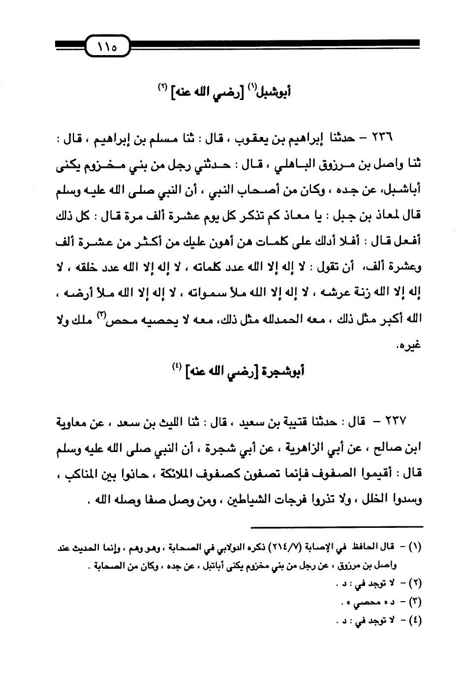 236 - حَدَّثَنَا إِبْرَاهِيمُ بْنُ يَعْقُوبَ قَالَ:، ثَنَا مُسْلِمُ بْنُ إِبْرَاهِيمَ قَالَ:، ثَنَا وَاصِلُ بْنُ مَرْزُوقٍ الْبَاهِلِيُّ قَالَ: حَدَّثَنِي رَجُلٌ مِنْ بَنِي مَخْزُومٍ يُكْنَى أَبَا شِبْلٍ عَنْ جَدِّهِ وَكَانَ مِنْ أَصْحَابِ النَّبِيِّ: أَنَّ النَّبِيَّ صَلَّى اللهُ عَلَيْهِ وَسَلَّمَ قَالَ لِمُعَاذِ بْنِ جَبَلٍ: «يَا مُعَاذُ كَمْ تَذْكُرُ كُلَّ يَوْمٍ عَشَرَةَ أَلْفِ مَرَّةٍ؟» قَالَ: كُلُّ ذَلِكَ أَفْعَلُ. قَالَ: " §أَفَلَا أَدُلُّكَ عَلَى كَلِمَاتٍ هُنَّ أَهْوَنُ عَلَيْكَ مِنْ أَكْثَرِ مِنْ عَشَرَةِ أَلْفٍ وَعَشَرَةِ أَلْفٍ؟ أَنْ تَقُولَ: لَا إِلَهَ إِلَّا اللَّهُ عَدَدَ كَلِمَاتِهِ، لَا إِلَهَ إِلَّا اللَّهُ عَدَدَ خَلْقِهِ، لَا إِلَهَ إِلَّا اللَّهُ زِنَةَ عَرْشِهِ، لَا إِلَهَ إِلَّا اللَّهُ مِلْءَ سَمَاوَاتِهِ، لَا إِلَهَ إِلَّا اللَّهُ مِلْءَ أَرْضِهِ، اللَّهُ أَكْبَرُ مِثْلُ ذَلِكَ مَعَهُ، وَالْحَمْدُ لِلَّهِ مِثْلُ ذَلِكَ مَعَهُ، لَا يُحْصِيهِ مُحْصٍ مَلَكٌ وَلَا غَيْرُهُ "