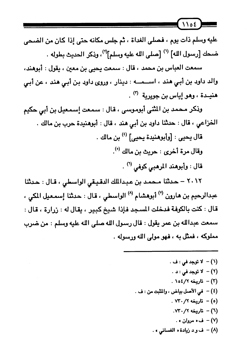 2012 - حَدَّثَنَا مُحَمَّدُ بْنُ عَبْدِ الْمَلِكِ الدَّقِيقِيُّ الْوَاسِطِيُّ، قَالَ: حَدَّثَنَا عَبْدُ الرَّحِيمِ بْنُ هَارُونَ أَبُو هِشَامٍ الْغَسَّانَيُّ الْوَاسِطِيُّ، قَالَ: حَدَّثَنَا إِسْمَاعِيلُ الْمَكِّيُّ قَالَ: كُنْتُ بِالْكُوفَةِ فَدَخَلْتُ الْمَسْجِدَ فَإِذَا شَيْخٌ كَبِيرٌ يُقَالُ لَهُ: زُرَارَةُ قَالَ: سَمِعْتُ عَبْدَ اللَّهِ بْنَ عُمَرَ يَقُولُ: قَالَ رَسُولُ اللَّهِ صَلَّى اللهُ عَلَيْهِ وَسَلَّمَ: «§مَنْ ضَرَبَ مَمْلُوكَهُ فَمَثَّلَ بِهِ فَهُوَ مَوْلَى اللَّهِ وَرَسُولِهِ»
