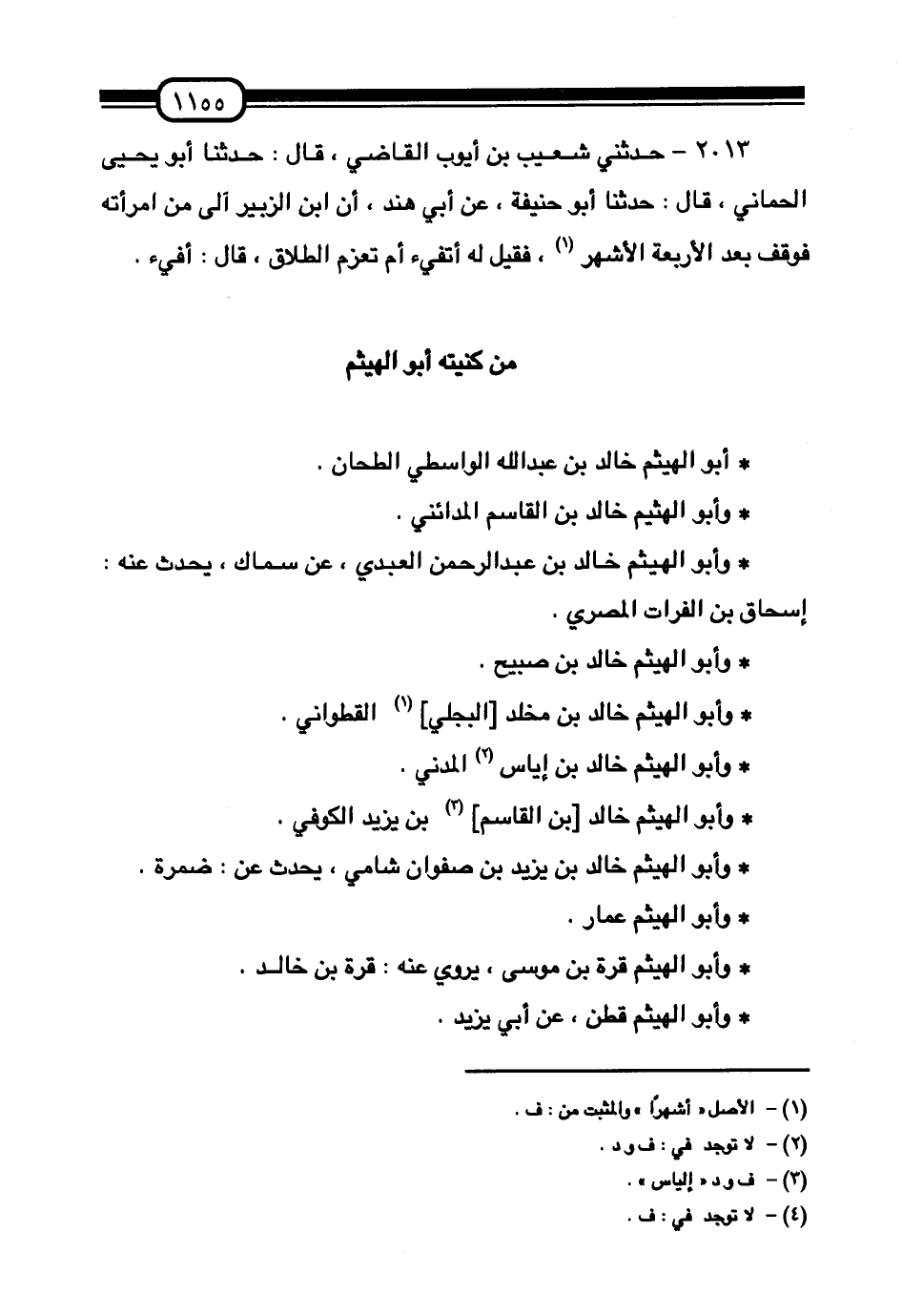 §مَنْ كُنْيَتُهُ أَبُو الْهَيْثَمِ أَبُو الْهَيْثَمِ خَالِدُ بْنُ عَبْدِ اللَّهِ الْوَاسِطِيُّ الطَّحَّانُ. وَأَبُو الْهَيْثَمِ خَالِدُ بْنُ الْقَاسِمِ الْمَدَائِنِيُّ. وَأَبُو الْهَيْثَمِ خَالِدُ بْنُ عَبْدِ الرَّحْمَنِ الْعَبْدِيُّ، عَنْ سِمَاكٍ، يُحَدِّثُ عَنْهُ: إِسْحَاقُ بْنُ الْفُرَاتِ الْمِصْرِيُّ. وَأَبُو الْهَيْثَمِ خَالِدُ بْنُ صَبِيحٍ. وَأَبُو الْهَيْثَمِ خَالِدُ بْنُ مَخْلَدٍ الْبَجَلِيُّ الْقَطَوَانِيُّ. وَأَبُو الْهَيْثَمِ خَالِدُ بْنُ إِيَّاسٍ الْمَدَنِيُّ. وَأَبُو الْهَيْثَمِ خَالِدُ بْنُ الْقَاسِمِ بْنِ يَزِيدَ الْكُوفِيُّ. وَأَبُو الْهَيْثَمِ خَالِدُ بْنُ يَزِيدَ بْنِ صَفْوَانَ شَامِيٌّ، يُحَدِّثُ عَنْ: ضَمْرَةَ. وَأَبُو الْهَيْثَمِ عَمَّارٌ. وَأَبُو الْهَيْثَمِ قَرَّةُ بْنُ مُوسَى، يَرْوِي عَنْهُ: قَرَّةُُ بْنُ خَالِدٍ. وَأَبُو الْهَيْثَمِ قَطَنُ، عَنْ أَبِي يَزِيدَ