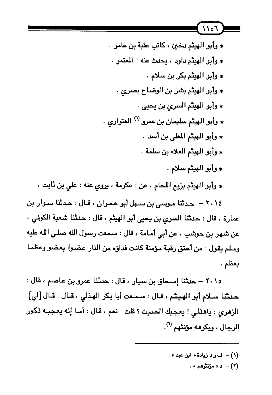 2015 - حَدَّثَنَا إِسْحَاقَ بْنِ سَيَّارٍ قَالَ: حَدَّثَنَا عَمْرُو بْنُ عَاصِمٍ، قَالَ: حَدَّثَنَا سَلَامٌ أَبُو الْهَيْثَمِ قَالَ: سَمِعْتُ أَبَا بَكْرٍ الْهُذَلِيُّ قَالَ: قَالَ لِيَ الزُّهْرِيُّ: «يَا هُذَلِيُّ يُعْجِبُكَ الْحَدِيثُ؟» قُلْتُ: نَعَمْ، قَالَ: «أَمَا إنَّهُ §يُعْجِبُهُ ذُكُورُ الرِّجَالِ، وَيَكْرَهُهُ مُؤَنَّثُهُمْ» -[1157]-. سَمِعْتُ الْعَبَّاسَ بْنَ مُحَمَّدٍ قَالَ: سَمِعْتُ ابْنَ مَعِينٍ يَقُولُ: " أَبُو الْهَيْثَمِ الْعَطَّارُ اسْمُهُ عَمَّارٌ. وَقَالَ: قُلْتُ لِيَحْيَى: أَبُو الْهَيْثَمِ الَّذِي يُحَدِّثُ عَنْهُ: دَرَّاجٌ، مَنْ هُوَ؟ قَالَ: «بَصْرِيٌّ، وَاسْمُهُ سُلَيْمَانُ بْنُ عَمْرٍو» . قَالَ: " وَأَبُو الْهَيْثَمِ صَاحِبُ الْقَصَبِ اسْمُهُ: عَمَّارٌ "