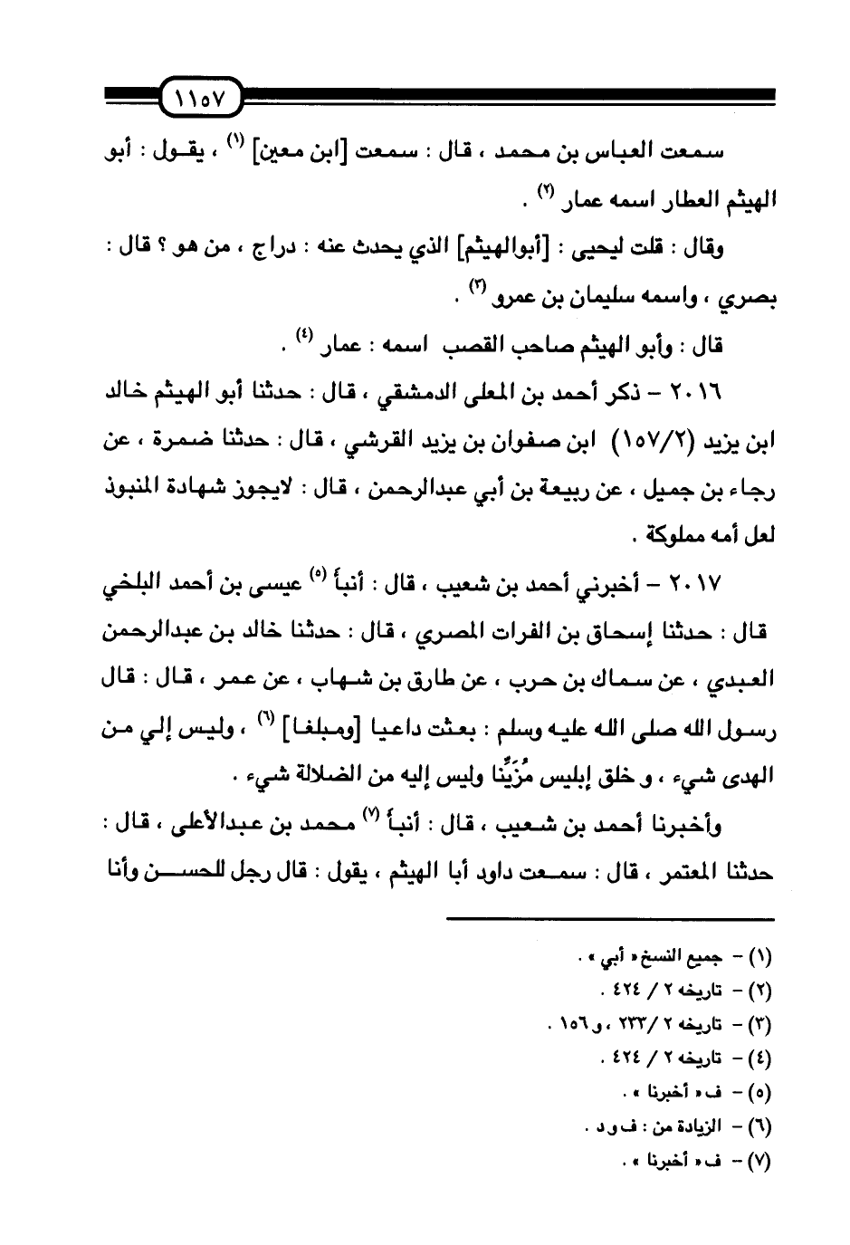 2017 - أَخْبَرَنِي أَحْمَدُ بْنُ شُعَيْبٍ، قَالَ: أَنْبَأَ عِيسَى بْنُ أَحْمَدَ الْبَلْخِيُّ قَالَ: حَدَّثَنَا إِسْحَاقُ بْنُ الْفُرَاتِ الْمِصْرِيُّ، قَالَ: حَدَّثَنَا خَالِدُ بْنُ عَبْدِ الرَّحْمَنِ الْعَبْدِيُّ، عَنْ سِمَاكِ بْنِ حَرْبٍ، عَنْ طَارِقِ بْنِ شِهَابٍ، عَنْ عُمَرَ قَالَ: قَالَ رَسُولُ اللَّهِ صَلَّى اللهُ عَلَيْهِ وَسَلَّمَ: «§بُعِثْتُ دَاعِيًا وَمُبَلِّغًا وَلَيْسَ إِلَيَّ مِنَ الْهُدَى شَيْءٌ، وَخُلِقَ إِبْلِيسُ مُزيِّنًا وَلَيْسَ إِلَيْهِ مِنَ الضَّلَالَةِ شَيْءٌ» وَأُخْبِرْنَا أَحْمَدُ بْنُ شُعَيْبٍ قَالَ: أَنْبَأَ مُحَمَّدُ بْنُ عَبْدِ الْأَعْلَى قَالَ: حَدَّثَنَا الْمُعْتَمِرُ قَالَ: سَمِعْتُ دَاوُدَ أَبَا الْهَيْثَمِ، يَقُولُ: قَالَ رَجُلٌ لِلْحَسَنِ وَأَنَا -[1158]- أَسْمَعُ: أَرَأَيْتُ دَمَ الْبَرَاغِيثِ يُصِيبُ الثَّوْبَ، قَالَ: «اغْسِلْهُ»
