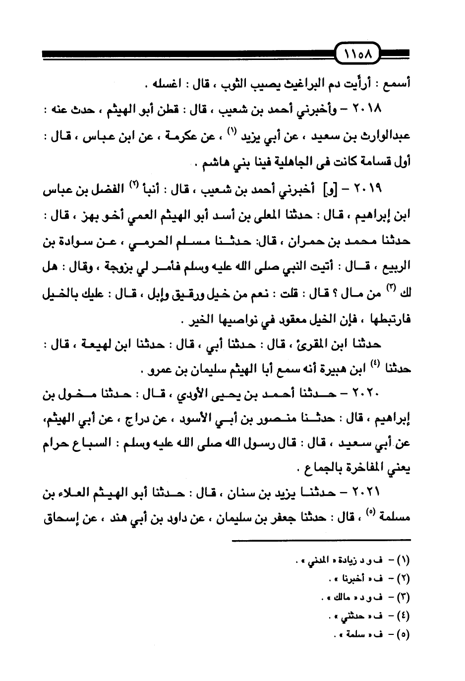 وَأَخْبَرَنِي أَحْمَدُ بْنُ شُعَيْبٍ قَالَ: أَنْبَأَ الْفَضْلُ بْنُ عَبَّاسِ بْنِ إِبْرَاهِيمَ قَالَ: حَدَّثَنَا الْمُعَلَّى بْنُ أَسَدٍ أَبُو الْهَيْثَمِ الْعَمِّيُّ أَخُو بَهْزٍ، قَالَ: حَدَّثَنَا مُحَمَّدُ بْنُ حُمْرَانَ قَالَ: حَدَّثَنَا مُسْلِمٌ الْحَرَمِيُّ، عَنْ سَوَادَةَ بْنِ الرَّبِيعِ، قَالَ: أُتِيَتُ النَّبِيَّ صَلَّى اللهُ عَلَيْهِ وَسَلَّمَ، فَأَمَرَ لِي بِزَوْجَةٍ، وَقَالَ: «هَلْ لَكَ مِنْ مَالٍ؟» قَالَ: قُلْتُ: نَعَمْ مِنْ خَيْلٍ وَرَقِيقٍ وَإِبِلٍ، قَالَ: «§عَلَيْكَ بِالْخَيْلِ فَارْتَبِطْهَا، فَإِنَّ الْخَيْلَ مَعْقُودٌ فِي نَوَاصِيهَا الْخَيْرُ» حَدَّثَنَا ابْنُ الْمُقْرِئِ قَالَ: حَدَّثَنَا أَبِي قَالَ: حَدَّثَنَا ابْنُ لَهِيعَةَ قَالَ: حَدَّثَنَا ابْنُ هُبَيْرَةَ أَنَّهُ سَمِعَ أَبَا الْهَيْثَمِ سُلَيْمَانَ بْنَ عَمْرٍو