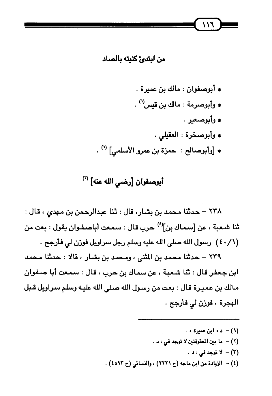 §مَنِ ابْتُدِئَ كُنْيَتُهُ بِالصَّادِ أَبُو صَفْوَانَ: مَالِكُ بْنُ عَمِيرَةَ. وَأَبُو صِرْمَةَ: مَالِكُ بْنُ قَيْسٍ. وَأَبُو صُعَيْرٍ. وَأَبُو صَخْرَةَ الْعَقِيلِيُّ. وَأَبُو صَالِحٍ: حَمْزَةُ بْنُ عَمْرٍو الْأَسْلَمِيُّ
