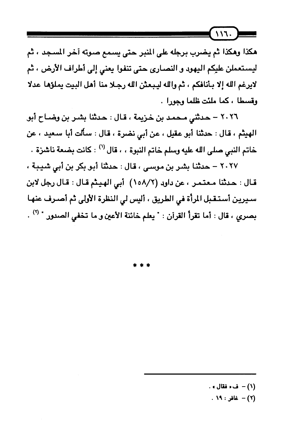2026 - حَدَّثَنِي مُحَمَّدُ بْنُ خُزَيْمَةَ قَالَ: حَدَّثَنَا بِشْرُ بْنُ وَضَّاحٍ أَبُو الْهَيْثَمِ قَالَ: حَدَّثَنَا أَبُو عَقِيلٍ، عَنْ أَبِي نَضْرَةَ قَالَ: سَأَلْتُ أَبَا سَعِيدٍ، عَنْ §خَاتَمِ النَّبِيِّ صَلَّى اللهُ عَلَيْهِ وَسَلَّمَ خَاتَمِ النُّبُوَّةِ، قَالَ: «كَانَتْ بِضْعَةً نَاشِزَةً»