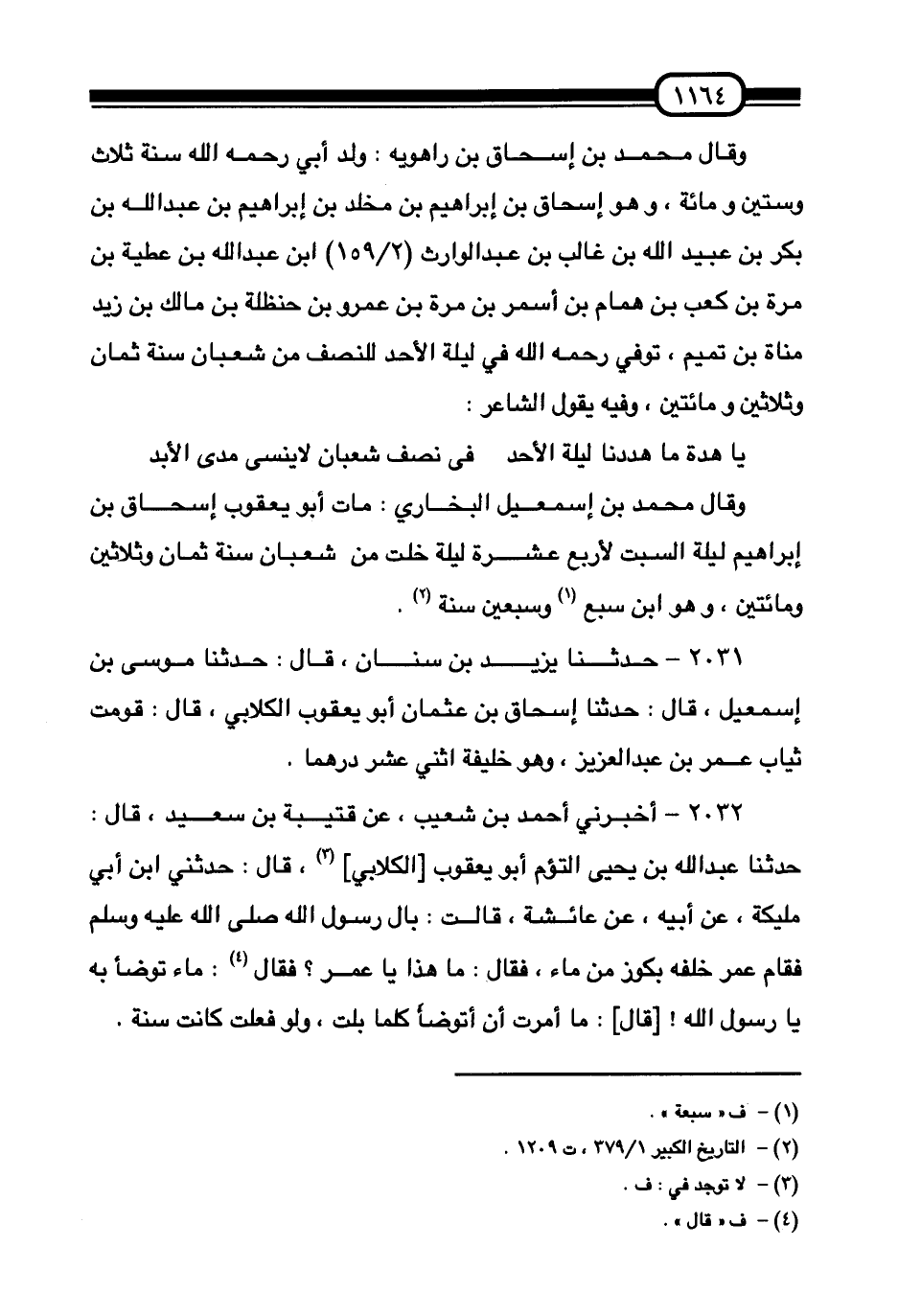 2031 - حَدَّثَنَا يَزِيدُ بْنُ سِنَانٍ، قَالَ: حَدَّثَنَا مُوسَى بْنُ إِسْمَاعِيلَ، قَالَ: حَدَّثَنَا إِسْحَاقُ بْنُ عُثْمَانَ أَبُو يَعْقُوبٍ الْكِلَابِيُّ، قَالَ: §قُوِّمَتْ ثِيَابُ عُمَرَ بْنِ عَبْدِ الْعَزِيزِ - وَهُوَ خَلِيفَةٌ - اثْنَيْ عَشَرَ دِرْهَمًا