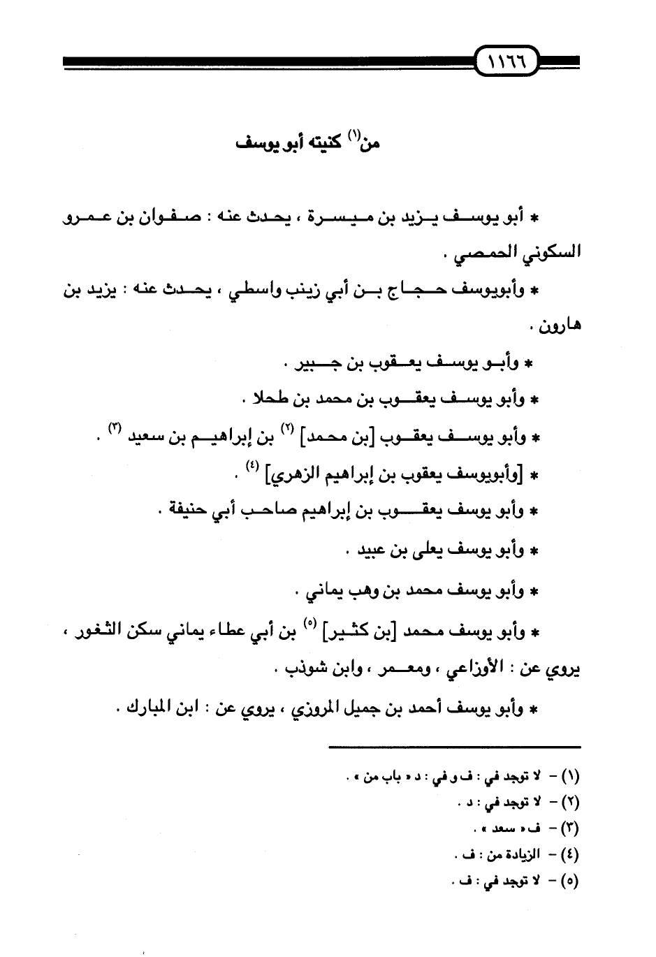 §مَنْ كُنْيَتُهُ أَبُو يُوسُفَ أَبُو يُوسُفَ يَزِيَدُ بْنُ مَيْسَرَةَ، يُحَدِّثُ عَنْهُ: صَفْوَانَ بْنِ عَمْرٍو السَّكُونِيُّ الْحِمْصِيُّ. وَأَبُو يُوسُفَ حَجَّاجُ بْنُ أَبِي زَيْنَبَ وَاسِطِيٌّ، يُحَدِّثُ عَنْهُ: يَزِيَدُ بْنُ هَارُونَ. وَأَبُو يُوسُفَ يَعْقُوبُ بْنُ جُبَيْرٍ. وَأَبُو يُوسُفَ يَعْقُوبُ بْنُ مُحَمَّدِ بْنِ طَحْلَا. وَأَبُو يُوسُفَ يَعْقُوبُ بْن مُحَمَّدِ بْنِ إِبْرَاهِيمَ بْنِ سَعِيدٍ. وَأَبُو يُوسُفَ يَعْقُوبُ بْنُ إِبْرَاهِيمَ الزُّهْرِيُّ. وَأَبُو يُوسُفَ يَعْقُوبُ بْنُ إِبْرَاهِيمَ صَاحِبُ أَبِي حَنِيفَةَ. وَأَبُو يُوسُفَ يَعْلَى بْنُ عُبَيْدٍ. وَأَبُو يُوسُفَ مُحَمَّدُ بْنُ وَهْبٍ يَمَانِيٌّ. وَأَبُو يُوسُفَ مُحَمَّدُ بْنُ كَثِيرِ بْنِ أَبِي عَطَاءٍ يَمَانِيٌّ سَكَنَ الثُّغُورَ، يَرْوِي عَنِ: الْأَوْزَاعِيِّ، وَمَعْمَرٍ، وَابْنِ شَوْذَبَ. وَأَبُو يُوسُفَ أَحْمَدُ بْنُ جَمِيلٍ الْمَرْوَزِيُّ، يَرْوِي عَنِ: ابْنِ الْمُبَارَكِ -[1167]-. وَأَبُو يُوسُفَ عُقْبَةُ بْنُ عَلْقَمَةَ الْبَيْرُوتِيُّ. وَأَبُو يُوسُفَ عَبْدُ اللَّهِ بْنُ سَالِمٍ الزُّبيْديُّ حِمْصِيٌّ. وَأَبُو يُوسُفَ أَسْبَاطُ بْنُ نَصْرٍ