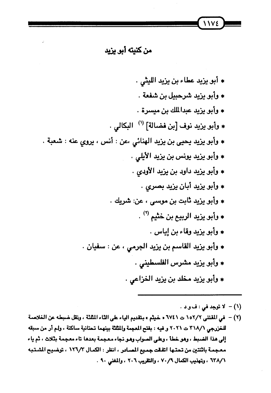 §مَنْ كُنْيَتُهُ أَبُو يَزِيدَ أَبُو يَزِيدَ عَطَاءُ بْنُ يَزِيَدَ اللَّيْثِيُّ. وَأَبُو يَزِيدَ شُرَحْبِيلُ بْنُ شُفْعَةَ. وَأَبُو يَزِيَدَ عَبْدُ الْمَلِكِ بْنُ مَيْسَرَةَ. وَأَبُو يَزِيدَ نَوَفُ بْنُ فَضَالَةَ الْبِكَالِيُّ. وَأَبُو يَزِيدَ يَحْيَى بْنُ يَزِيَدَ الْهُنَائِيُّ، عَنْ: أَنَسٍ، يَرْوِي عَنْهُ: شُعْبَةُ. وَأَبُو يَزِيدَ يُونُسُ بْنُ يَزِيدَ الْأيلِيُّ. وَأَبُو يَزِيدَ دَاوُدُ بْنُ يَزِيدَ الْأَوْدِيُّ. وَأَبُو يَزِيدَ أَبَانُ يَزِيدَ بَصْرِيٌّ وَأَبُو يَزِيدَ ثَابِتُ بْنُ مُوسَى، عَنْ شَرِيكٍ. وَأَبُو يَزِيَدَ الرَّبِيعُ بْنُ خُثَيْمٍ. وَأَبُو يَزِيدَ وِقَاءُ بْنُ إِيَّاسٍ. وَأَبُو يَزِيدَ الْقَاسِمُ بْنُ يَزِيدَ الْجُرْمِيُّ، عَنْ: سَفْيَانَ. وَأَبُو يَزِيدَ مِشْرَسٌ الْفِلَسْطِينِيُّ. وَأَبُو يَزِيدَ مَخْلَدُ بْنُ يَزِيدَ الْخُزَاعِيُّ