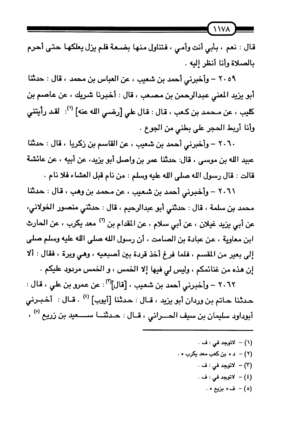 2059 - وَأَخْبَرَنِي أَحْمَدُ بْنُ شُعَيْبٍ، عَنِ الْعَبَّاسِ بْنِ مُحَمَّدٍ، قَالَ: حَدَّثَنَا أَبُو يَزِيدَ الْمَعْنِيُّ عَبْدُ الرَّحْمَنِ بْنُ مُصْعَبٍ، قَالَ: أَخْبَرَنَا شَرِيكٌ، عَنْ عَاصِمِ بْنِ كُلَيْبٍ، عَنْ مُحَمَّدِ بْنِ كَعْبٍ قَالَ: قَالَ عَلِيٌّ رَضِيَ اللَّهُ عَنْهُ: «§لَقَدْ رَأَيْتُنِي وَأَنَا أَرْبِطُ الْحَجَرَ عَلَى بَطْنِي مِنَ الْجُوعِ»