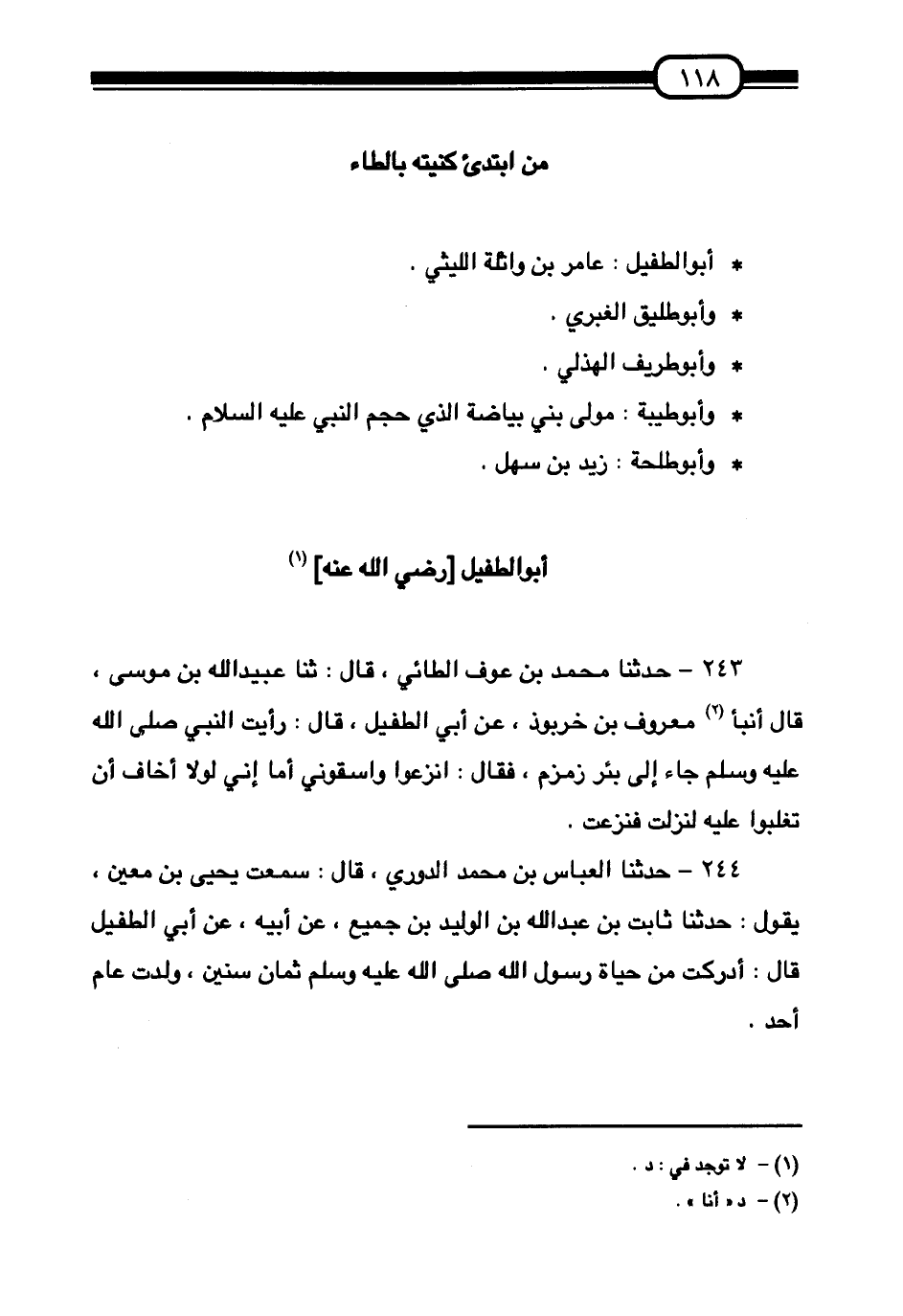 §مَنِ ابْتُدِئَ كُنْيَتُهُ بِالطَّاءِ أَبُو الطُّفَيْلِ: عَامِرُ بْنُ وَاثِلَةَ اللَّيْثِيُّ. وَأَبُو طَلِيقٍ الْغَبَرِيُّ. وَأَبُو طَرِيفٍ الْهُذَلِيُّ. وَأَبُو طَيْبَةَ: مَوْلَى بَنِي بَيَاضَةَ الَّذِي حَجَمَ النَّبِيَّ عَلِيْهِ السَّلَامُ. وَأَبُو طَلْحَةَ: زَيْدُ بْنُ سَهْلٍ