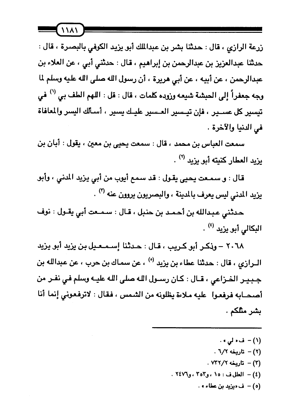 2068 - وذَكَرَ أَبُو كُرَيْبٍ قَالَ: حَدَّثَنَا إِسْمَاعِيلُ بْنُ يَزِيدَ أَبُو يَزِيدَ الرَّازِيُّ، قَالَ: حَدَّثَنَا عَطَاءُ بْنُ يَزِيدَ، عَنْ سِمَاكِ بْنِ حَرْبٍ، عَنْ عَبْدِ اللَّهِ بْنِ جُبَيْرٍ الْخُزَاعِيِّ قَالَ: كَانَ رَسُولُ اللَّهِ صَلَّى اللهُ عَلَيْهِ وَسَلَّمَ فِي نَفَرٍ مِنْ أَصْحَابِهِ فَرَفَعُوا عَلَيْهِ مُلَاءَةً يُظِلُّونَهُ مِنَ الشَّمْسِ فَقَالَ: «§لَا تَرْفَعُونِي إِنَّمَا أَنَا بَشَرٌ مِثْلُكُمْ»