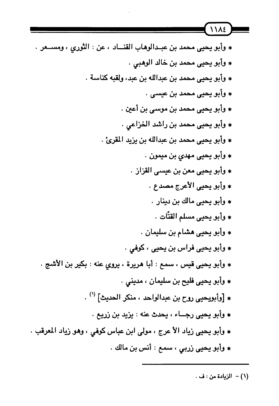وَأَبُو يَحْيَى مُحَمَّدُ بْنُ عَبْدِ الْوَهَّابِ الْقَنَّادُ، عَنِ: الثَّوْرِيِّ، وَمِسْعَرٌ وَأَبُو يَحْيَى مُحَمَّدُ بْنُ خَالِدٍ الْوَهْبِيُّ. وَأَبُو يَحْيَى مُحَمَّدُ بْنُ عَبْدِ اللَّهِ بْنِ عَبْدٍ، وَلَقَبُهُ كُنَاسَةُ. وَأَبُو يَحْيَى مُحَمَّدُ بْنُ عِيسَى. وَأَبُو يَحْيَى مُحَمَّدُ بْنُ مُوسَى بْنِ أَعْيَنَ. وَأَبُو يَحْيَى مُحَمَّدُ بْنُ رَاشِدٍ الْخُزَاعِيُّ. وَأَبُو يَحْيَى مُحَمَّدُ بْنُ عَبْدِ اللَّهِ بْنِ يَزِيدَ الْمُقْرِئُ. وَأَبُو يَحْيَى مَهْدِيُّ بْنُ مَيْمُونٍ. وَأَبُو يَحْيَى مَعْنُ بْنُ عِيسَى الْقَزَّازُ. وَأَبُو يَحْيَى الْأَعْرَجُ مِصْدَعٌ. وَأَبُو يَحْيَى مَالِكُ بْنُ دِينارٍ. وَأَبُو يَحْيَى مُسْلِمٌ الْقَتَّاتُ. وَأَبُو يَحْيَى هِشَامُ بْنُ سُلَيْمَانَ. وَأَبُو يَحْيَى فِرَاسُ بْنُ يَحْيَى، كُوفِيٌّ. وَأَبُو يَحْيَى قَيْسٌ، سَمِعَ: أَبَا هُرَيْرَةَ، يَرْوِي عَنْهُ: بُكَيْرُ بْنُ الْأَشَجِّ. وَأَبُو يَحْيَى فُلَيْحُ بْنُ سُلَيْمَانَ، مَدِينِيٌّ وَأَبُو يَحْيَى رُوحُ بْنُ عَبْدِ الْوَاحِدِ مُنْكَرُ الْحَدِيثِ وَأَبُو يَحْيَى رَجَاءٌ، يُحَدِّثُ عَنْهُ: يَزِيدُ بْنُ زُرَيْعٍ. وَأَبُو يَحْيَى زِيَادٌ الْأَعْرَجُ، مَوْلَى ابْنِ عَبَّاسٍ كُوفِيٌّ، وَهُوَ زِيَادٌ الْمُعَرْقَبُ. وَأَبُو يَحْيَى زَرْبِيٌّ، سَمِعَ: أَنَسَ بْنَ مَالِكٍ