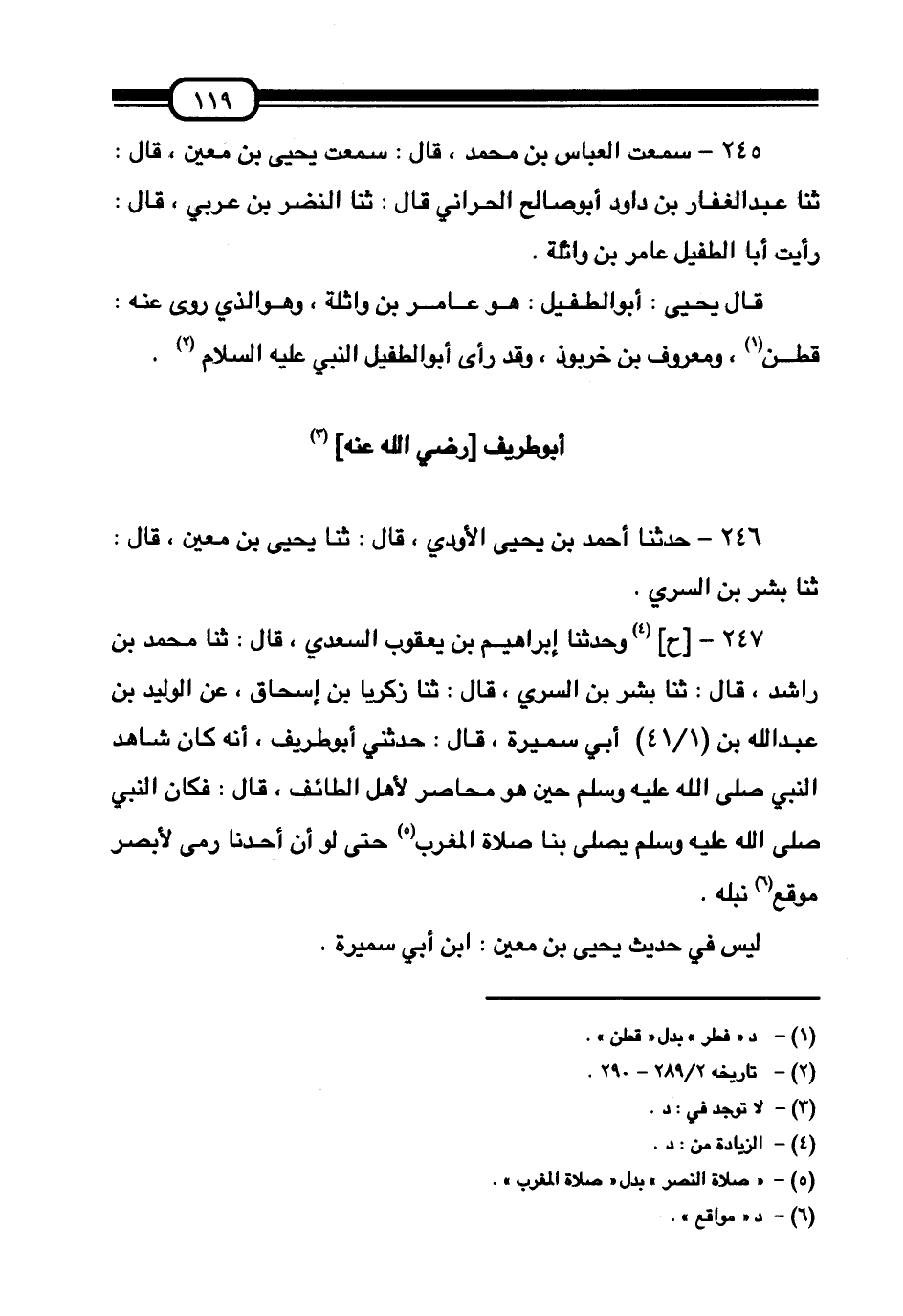 245 - سَمِعْتُ الْعَبَّاسَ بْنَ مُحَمَّدٍ قَالَ: سَمِعْتُ يَحْيَى بْنَ مَعِينٍ قَالَ: ثنا عَبْدُ الْغَفَّارِ بْنُ دَاوُدَ أَبُو صَالِحٍ الْحَرَّانِيُّ قَالَ: ثنا النَّضْرُ بْنُ عَرَبِيٍّ قَالَ: «§رَأَيْتُ أَبَا الطُّفَيْلِ عَامِرَ بْنَ وَاثِلَةَ» . قَالَ يَحْيَى: " أَبُو الطُّفَيْلِ: هُوَ عَامِرُ بْنُ وَاثِلَةَ، وَهُوَ الَّذِي رَوَى عَنْهُ قَطَنٌ، وَمَعْرُوفُ بْنُ خَرَّبُوذَ، وَقَدْ رَأَى أَبُو الطُّفَيْلِ النَّبِيَّ عَلَيْهِ السَّلَامُ "