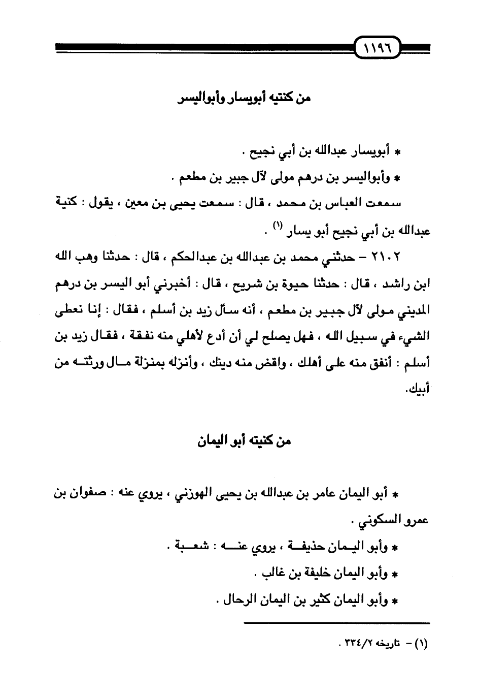 §مَنْ كُنْيَتُهُ أَبُو يَسَارٍ، وَأَبُو الْيَسَرِ أَبُو يَسَارٍ عَبْدُ اللَّهِ بْنُ أَبِي نَجِيحٍ. وَأَبُو الْيُسْرِ بْنُ دِرْهَمٍ مَوْلًى لِآلِ جُبَيْرِ بْنِ مَطْعَمٍ سَمِعْتُ الْعَبَّاسَ بْنَ مُحَمَّدٍ قَالَ: سَمِعْتُ يَحْيَى بْنَ مَعِينٍ يَقُولُ: «كُنْيَةُ عَبْدِ اللَّهِ بْنِ أَبِي نَجِيحٍ أَبُو يَسَارٍ»