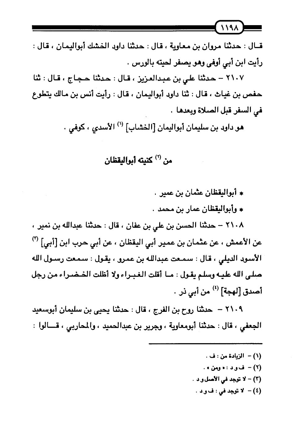 2107 - حَدَّثَنَا عَلِيُّ بْنُ عَبْدِ الْعَزِيزِ، قَالَ: حَدَّثَنَا حَجَّاجٌ، قَالَ: ثنا حَفْصُ بْنُ غِيَاثٍ، قَالَ: ثنا دَاوُدُ أَبُو الْيَمَانِ، قَالَ: «رَأَيْتُ أَنَسَ بْنَ مَالِكٍ §يَتَطَوَّعُ فِي السَّفَرِ قَبْلَ الصَّلَاةِ وَبَعْدَهَا» ، هُوَ دَاوُدُ بْنُ سُلَيْمَانَ أَبُو الْيَمَانِ الْخَشَّابُ الْأَسَدِيُّ كُوفِيٌّ