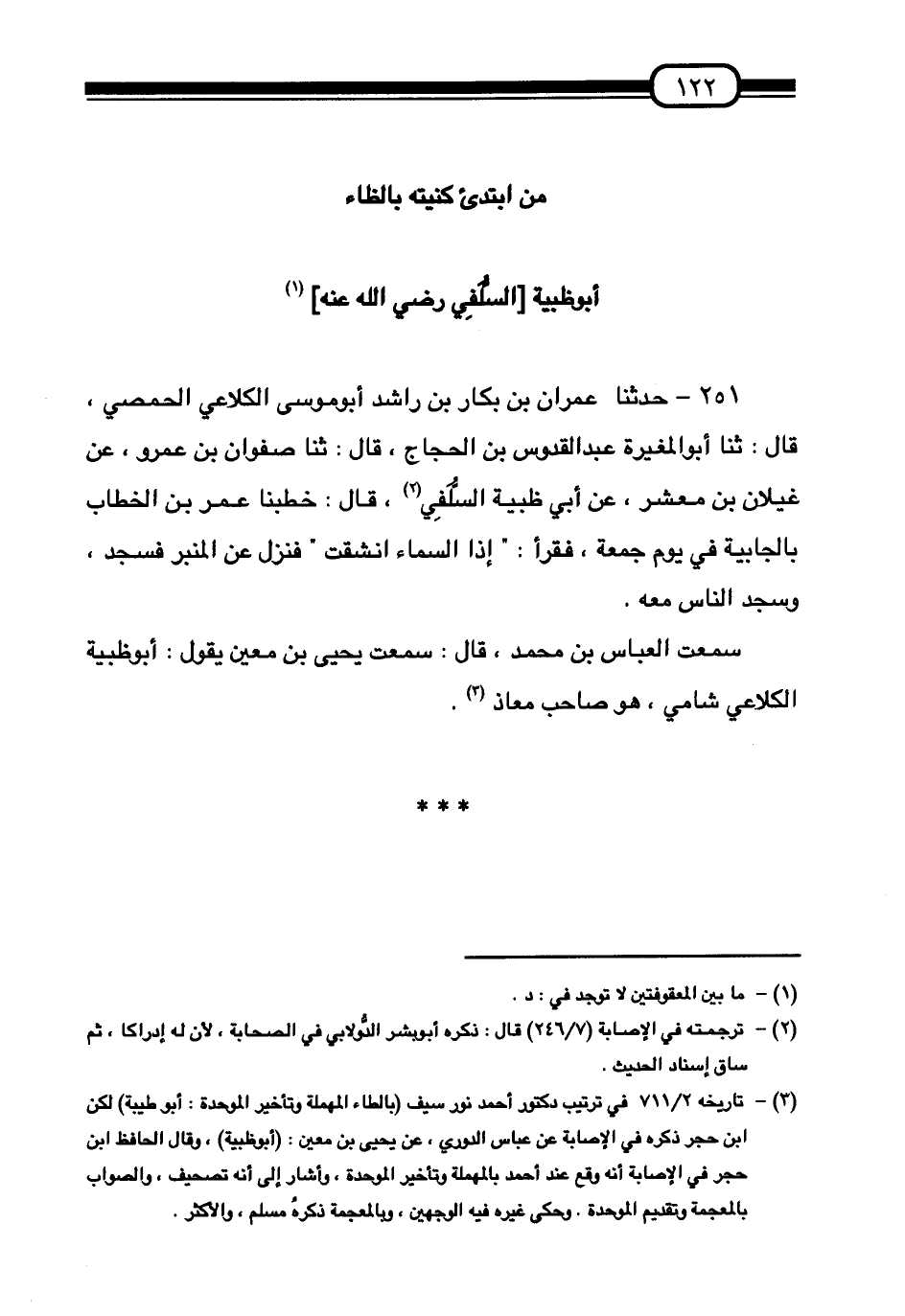 251 - حَدَّثَنَا عِمْرَانُ بْنُ بَكَّارِ بْنِ رَاشِدٍ أَبُو مُوسَى الْكَلَاعِيُّ الْحِمْصِيُّ قَالَ:، ثَنَا أَبُو الْمُغِيرَةِ عَبْدُ الْقُدُّوسِ بْنُ الْحَجَّاجِ قَالَ:، ثَنَا صَفْوَانُ بْنُ عَمْرٍو، عَنْ غَيْلَانَ بْنِ مَعْشَرٍ عَنْ أَبِي ظَبْيَةَ السَّلَفِيِّ قَالَ: «§خَطَبَنَا عُمَرُ بْنُ الْخَطَّابِ بِالْجَابِيَةِ فِي يَوْمِ جُمُعَةٍ فَقَرَأَ إِذَا السَّمَاءُ انْشَقَّتْ فَنَزَلَ عَنِ الْمِنْبَرِ فَسَجَدَ وَسَجَدَ النَّاسُ مَعَهُ» . سَمِعْتُ الْعَبَّاسَ بْنَ مُحَمَّدٍ قَالَ: سَمِعْتُ يَحْيَى بْنَ مَعِينٍ يَقُولُ: «أَبُو ظَبْيَةَ الْكُلَاعِيُّ شَامِيٌّ، هُوَ صَاحِبُ مُعَاذٍ»