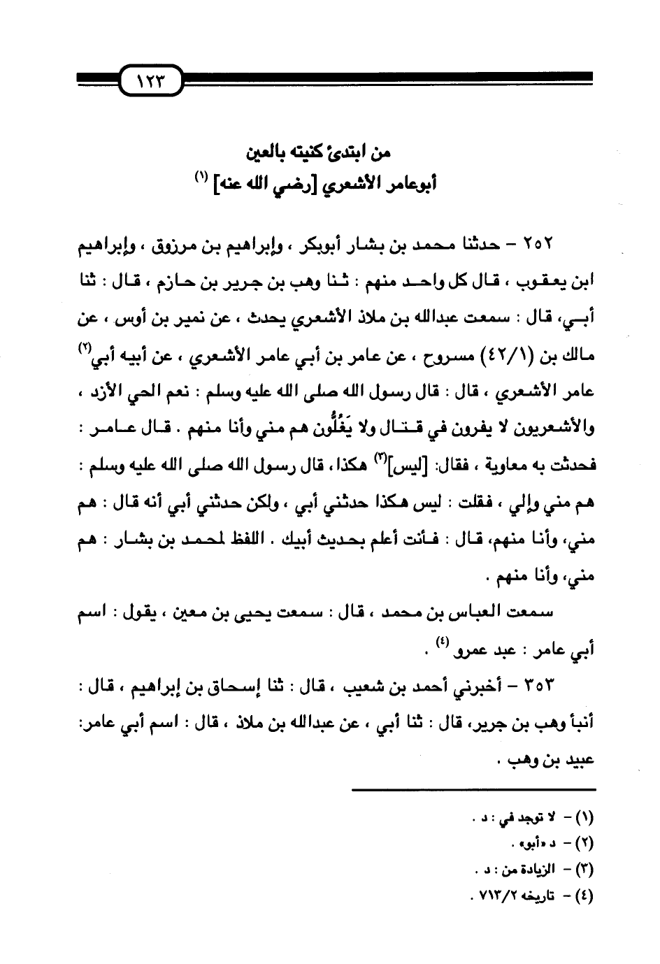 252 - حَدَّثَنَا مُحَمَّدُ بْنُ بَشَّارٍ أَبُو بَكْرٍ وَإِبْرَاهِيمُ بْنُ مَرْزُوقٍ وَإِبْرَاهِيمُ بْنُ يَعْقُوبَ قَالَ كُلُّ وَاحِدٍ مِنْهُمْ:، ثَنَا وَهْبُ بْنُ جَرِيرِ بْنِ حَازِمٍ قَالَ:، ثَنَا أَبِي قَالَ: سَمِعْتُ عَبْدَ اللَّهِ بْنَ مَلَاذٍ الْأَشْعَرِيَّ يُحَدِّثُ عَنْ نُمَيْرِ بْنِ أَوْسٍ، عَنْ مَالِكِ بْنِ مَسْرُوحٍ، عَنْ عَامِرِ بْنِ أَبِي عَامِرٍ الْأَشْعَرِيِّ عَنْ أَبِيهِ أَبِي عَامِرٍ الْأَشْعَرِيِّ قَالَ: قَالَ رَسُولُ اللَّهِ صَلَّى اللهُ عَلَيْهِ وَسَلَّمَ: «§نِعْمَ الْحَيُّ الْأَزْدُ وَالْأَشْعَرِيُّونَ لَا يَفِرُّونَ فِي قِتَالٍ وَلَا يَغُلُّونَ، هُمْ مِنِّي وَأَنَا مِنْهُمْ» . قَالَ عَامِرٌ: فَحَدَّثْتُ بِهِ مُعَاوِيَةَ فَقَالَ: لَيْسَ هَكَذَا، قَالَ رَسُولُ اللَّهِ صَلَّى اللهُ عَلَيْهِ وَسَلَّمَ: «هُمْ مِنِّي وَإِلَيَّ» . فَقُلْتُ: لَيْسَ هَكَذَا حَدَّثَنِي أَبِي وَلَكِنْ حَدَّثَنِي أَبِي أَنَّهُ قَالَ: «هُمْ مِنِّي وَأَنَا مِنْهُمْ» قَالَ: فَأَنْتَ أَعْلَمُ بِحَدِيثِ أَبِيكَ. اللَّفْظُ لِمُحَمَّدِ بْنِ بَشَّارٍ «هُمْ مِنِّي وَأَنَا مِنْهُمْ» . سَمِعْتُ الْعَبَّاسَ بْنَ مُحَمَّدٍ قال: سَمِعْتُ يَحْيَى بْنَ مَعِينٍ يَقُولُ: " اسْمُ أَبِي عَامِرٍ: عَبْدُ عَمْرٍو "