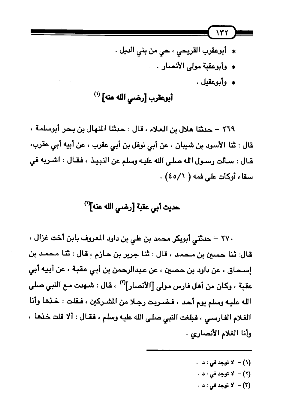 270 - حَدَّثَنِي أَبُو بَكْرٍ مُحَمَّدُ بْنُ عَلِيِّ بْنِ دَاوُدَ الْمَعْرُوفُ بِابْنِ أُخْتِ غَزَّالٍ قَالَ: ثَنَا حُسَيْنُ بْنُ مُحَمَّدٍ، قَالَ: ثَنَا جَرِيرُ بْنُ حَازِمٍ، قَالَ: ثَنَا مُحَمَّدُ بْنُ إِسْحَاقَ , عَنْ دَاوُدَ بْنِ حُصَيْنٍ، عَنْ عَبْدِ الرَّحْمَنِ بْنِ أَبِي عُقْبَةَ، عَنْ أَبِيهِ أَبِي عُقْبَةَ، وَكَانَ مِنْ أَهْلِ فَارِسَ مَوْلَى الْأَنْصَارِ قَالَ: شَهِدْتُ مَعَ النَّبِيِّ صَلَّى اللهُ عَلَيْهِ وَسَلَّمَ يَوْمَ أُحُدٍ فَضَرَبْتُ رَجُلًا مِنَ الْمُشْرِكِينَ فَقُلْتُ: خُذْهَا وَأَنَا الْغُلَامُ الْفَارِسِيُّ، فَبَلَغَتِ النَّبِيَّ صَلَّى اللهُ عَلَيْهِ وَسَلَّمَ فَقَالَ: «§أَلَا قُلْتَ خُذْهَا وَأَنَا الْغُلَامُ الْأَنْصَارِيُّ» -[133]-. أَبُو عَمْرِو بْنُ حَفْصِ بْنِ الْمُغِيرَةِ الْمَخْزُومِيُّ. وَأَبُو عَمْرِو بْنُ حَمَاسٍ. وَأَبُو عَمْرٍو الشَّيْبَانِيُّ. وَأَبُو عَمْرَةَ بْنُ مِحْصَنٍ الْأَنْصَارِيُّ وَالِدُ عَبْدِ الرَّحْمَنِ