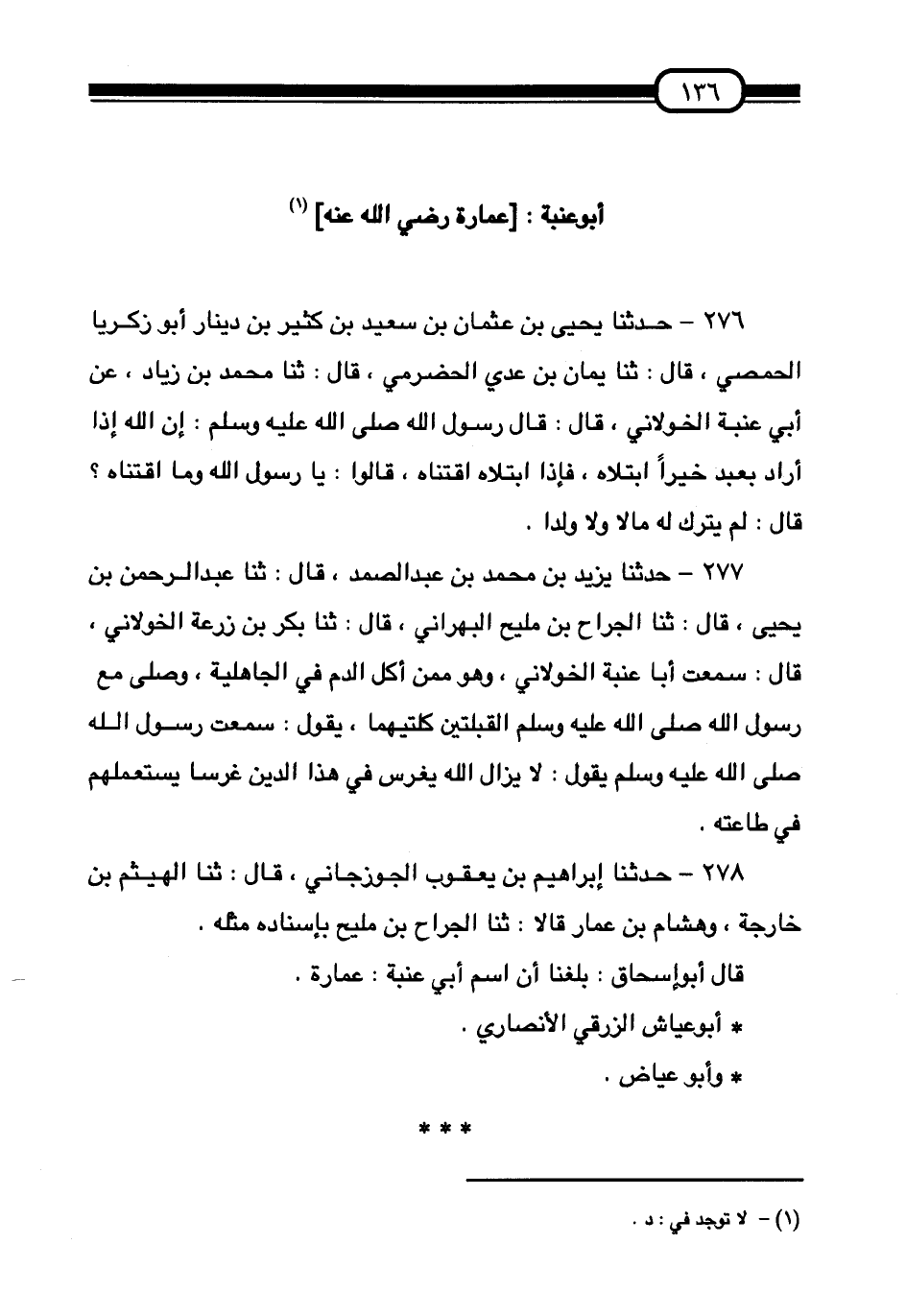 278 - حَدَّثَنَا إِبْرَاهِيمُ بْنُ يَعْقُوبَ الْجَوْزَجَانِيُّ قَالَ: ثنا الْهَيْثَمُ بْنُ خَارِجَةَ، وَهِشَامُ بْنُ عَمَّارٍ قَالَا: ثنا الْجَرَّاحُ بْنُ مَلِيحٍ بِإِسْنَادِهِ مِثْلَهُ. قَالَ أَبُو إِسْحَاقَ: " بَلَغَنَا أَنَّ اسْمَ أَبِي عِنَبَةَ: عُمَارَةُ ". أَبُو عَيَّاشٍ الزُّرَقِيُّ الْأَنْصَارِيُّ. وَأَبُو عِيَاضٍ