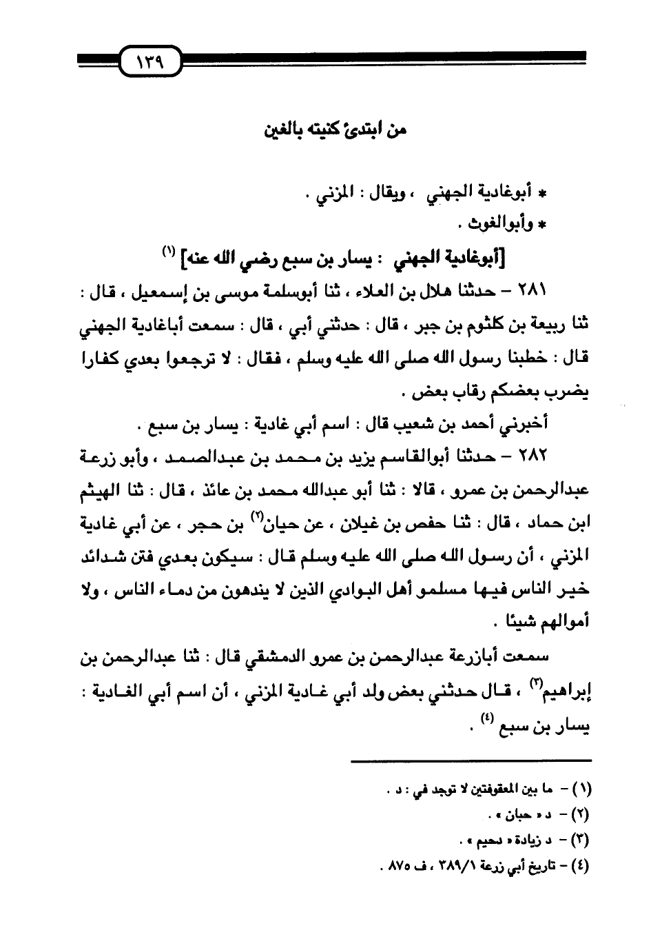 282 - حَدَّثَنَا أَبُو الْقَاسِمِ يَزِيدُ بْنُ مُحَمَّدِ بْنِ عَبْدِ الصَّمَدِ وَأَبُو زُرْعَةَ عَبْدُ الرَّحْمَنِ بْنُ عَمْرٍو قَالَا:، ثَنَا أَبُو عَبْدِ اللَّهِ مُحَمَّدُ بْنُ عَائِذٍ قَالَ:، ثَنَا الْهَيْثَمُ بْنُ حُمَيْدٌ قَالَ:، ثَنَا حَفْصُ بْنُ غَيْلَانَ، عَنْ حَيَّانَ بْنِ حُجْرٍ عَنْ أَبِي غَادِيَةَ الْمُزَنِيِّ أَنَّ رَسُولَ اللَّهِ صَلَّى اللهُ عَلَيْهِ وَسَلَّمَ قَالَ: «§سَيَكُونُ بَعْدِي فِتَنٌ شَدَائِدُ، خَيْرُ النَّاسِ فِيهَا مُسْلِمُوا أَهْلِ الْبَوَادِي الَّذِينَ لَا يَنْدَهُونُ مِنْ دِمَاءِ النَّاسِ وَلَا أَمْوَالِهِمْ شَيْئًا» . سَمِعْتُ أَبَا زُرْعَةَ عَبْدَ الرَّحْمَنِ بْنَ عَمْرٍو الدِّمَشْقِيَّ قَالَ:، ثَنَا عَبْدُ الرَّحْمَنِ بْنُ إِبْرَاهِيمَ قَالَ: حَدَّثَنِي بَعْضُ وَلَدِ أَبِي غَادِيَةَ الْمُزَنِيِّ أَنَّ اسْمَ أَبِي الْغَادِيَةِ يَسَارُ بْنُ سَبْعٍ -[140]- سَمِعْتُ الْعَبَّاسَ يَقُولُ: سَمِعْتُ يَحْيَى بْنَ مَعِينٍ يَقُولُ: أَبُو غَادِيَةَ يَرْوِي عَنْهُ عَبْدُ الْمَلِكِ بْنُ عُمَيْرٍ وَالْحَسَنُ بْنُ هَانِئٍ وَهُوَ وَاحِدٌ لَيْسَ غَيْرُهُ وَهُوَ جُهَنِيٌّ