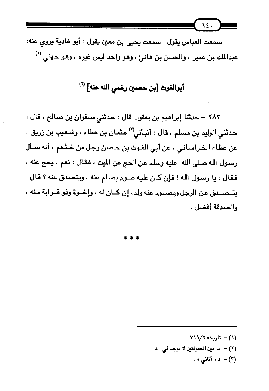 283 - حَدَّثَنَا إِبْرَاهِيمُ بْنُ يَعْقُوبَ قَالَ: حَدَّثَنِي صَفْوَانُ بْنُ صَالِحٍ قَالَ: حَدَّثَنِي الْوَلِيدُ بْنُ مُسْلِمٍ قَالَ: أَنْبَأَنِي عُثْمَانُ بْنُ عَطَاءٍ وَشُعَيْبُ بْنُ زُرَيْقٍ , عَنْ عَطَاءٍ الْخُرَاسَانِيِّ عَنْ أَبِي الْغَوْثِ بْنِ حُصَيْنٍ رَجُلٍ مِنْ خَثْعَمٍ أَنَّهُ §سَأَلَ رَسُولَ اللَّهِ صَلَّى اللهُ عَلَيْهِ وَسَلَّمَ عَنِ الْحَجِّ عَنِ الْمَيِّتِ فَقَالَ: «نَعَمْ يُحَجُّ عَنْهُ» ، فَقَالَ: يَا رَسُولَ اللَّهِ فَإِنْ كَانَ عَلَيْهِ صَوْمٌ يُصَامُ عَنْهُ وَيُتَصَدَّقُ عَنْهُ؟ قَالَ: «يَتَصَدَّقُ عَنِ الرَّجُلِ وَيَصُومُ عَنْهُ وَلَدٌ إِنْ كَانَ لَهُ وَإِخْوَةٌ وَذُو قَرَابَةٍ مِنْهُ وَالصَّدَقَةُ أَفْضَلُ»