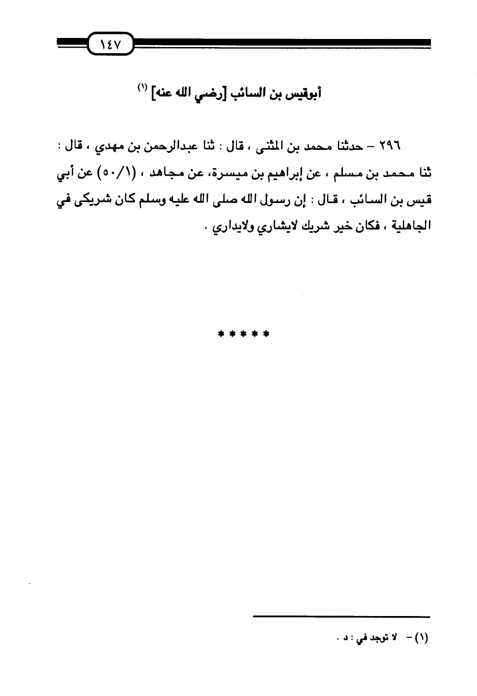 296 - حَدَّثَنَا مُحَمَّدُ بْنُ الْمُثَنَّى قَالَ:، ثَنَا عَبْدُ الرَّحْمَنِ بْنُ مَهْدِيٍّ قَالَ:، ثَنَا مُحَمَّدُ بْنُ مُسْلِمٍ , عَنْ إِبْرَاهِيمَ بْنِ مَيْسَرَةَ، عَنْ مُجَاهِدٍ عَنْ أَبِي قَيْسِ بْنِ السَّائِبِ قَالَ: «§إِنَّ رَسُولَ اللَّهِ صَلَّى اللهُ عَلَيْهِ وَسَلَّمَ كَانَ شَرِيكِي فِي الْجَاهِلِيَّةِ فَكَانَ خَيْرَ شَرِيكٍ لَا يُشَارِي وَلَا يُدَارِي»