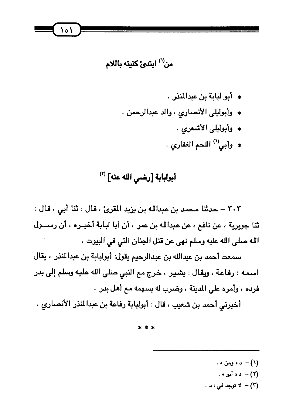 §مَنِ ابْتُدِئَ كُنْيَتُهُ بِاللَّامِ أَبُو لُبَابَةَ بْنُ عَبْدِ الْمُنْذِرِ. وَأَبُو لَيْلَى الْأَنْصَارِيُّ وَالِدُ عَبْدِ الرَّحْمَنِ. وَأَبُو لَيْلَى الْأَشْعَرِيُّ. وَآبِي اللَّحْمِ الْغِفَارِيُّ