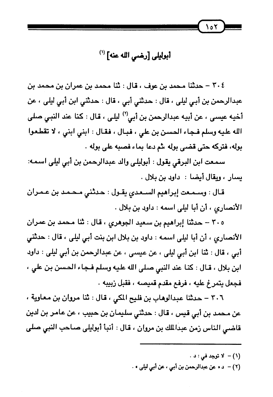 304 - حَدَّثَنَا مُحَمَّدُ بْنُ عَوْفٍ قَالَ:، ثَنَا مُحَمَّدُ بْنُ عِمْرَانَ بْنِ مُحَمَّدِ بْنِ عَبْدِ الرَّحْمَنِ بْنِ أَبِي لَيْلَى قَالَ: حَدَّثَنِي أَبِي قَالَ: حَدَّثَنِي ابْنُ أَبِي لَيْلَى، عَنْ أَخِيهِ عِيسَى عَنْ أَبِيهِ عَبْدِ الرَّحْمَنِ بْنِ أَبِي لَيْلَى قَالَ: كُنَّا عِنْدَ النَّبِيِّ صَلَّى اللهُ عَلَيْهِ وَسَلَّمَ §فَجَاءَ الْحَسَنُ بْنُ عَلِيٍّ فَبَالَ فَقَالَ: «ابْنِي ابْنِي لَا تَقْطَعُوا بَوْلَهُ» فَتَرَكَهُ حَتَّى قَضَى بَوْلَهُ، ثُمَّ دَعَا بِمَاءٍ فَصَبَّهُ عَلَى بَوْلِهِ سَمِعْتُ ابْنَ الْبَرْقِيِّ يَقُولُ: أَبُو لَيْلَى وَالِدُ عَبْدِ الرَّحْمَنِ بْنِ أَبِي لَيْلَى اسْمُهُ: يَسَارٌ وَيُقَالُ أَيْضًا: دَاوُدُ بْنُ بِلَالٍ، قَالَ: وَسَمِعْتُ إِبْرَاهِيمَ السَّعْدِيَّ يَقُولُ: حَدَّثَنِي مُحَمَّدُ بْنُ عِمْرَانَ الْأَنْصَارِيُّ أَنَّ أَبَا لَيْلَى اسْمُهُ دَاوُدُ بْنُ بِلَالٍ