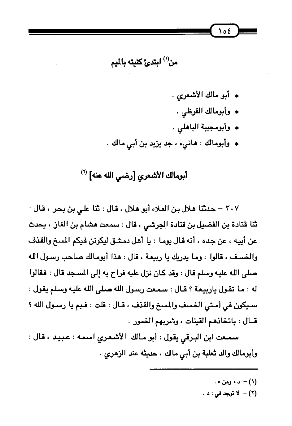 §مَنِ ابْتُدِئَ كُنْيَتُهُ بِالْمِيمِ أَبُو مَالِكٍ الْأَشْعَرِيُّ. وَأَبُو مَالِكٍ الْقُرَظِيُّ. وَأَبُو مُجِيبَةَ الْبَاهِلِيُّ. وَأَبُو مَالِكٍ: هَانِئٌ جَدُّ يَزِيدَ بْنِ أَبِي مَالِكٍ