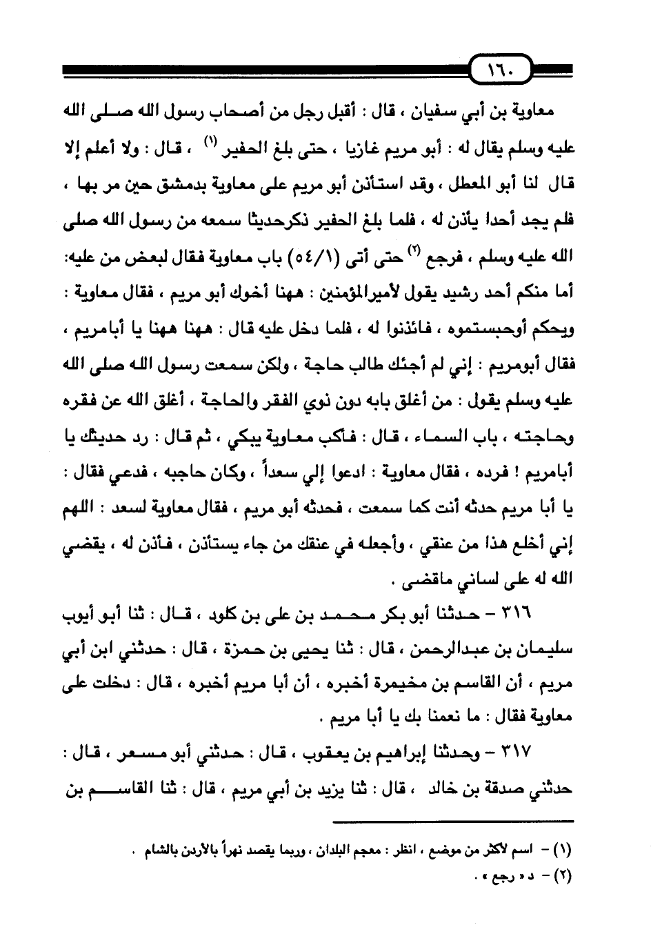 316 - حَدَّثَنَا أَبُو بَكْرٍ مُحَمَّدُ بْنُ عَلِيِّ بْنِ كلود قَالَ: ثنا أَبُو أَيُّوبَ سُلَيْمَانُ بْنُ عَبْدِ الرَّحْمَنِ قَالَ: ثنا يَحْيَى بْنُ حَمْزَةَ قَالَ: حَدَّثَنِي ابْنُ أَبِي مَرْيَمَ، أَنَّ الْقَاسِمَ بْنَ مُخَيْمِرَةَ أَخْبَرَهُ أَنَّ أَبَا مَرْيَمَ أَخْبَرَهُ، قَالَ: دَخَلْتُ عَلَى مُعَاوِيَةَ فَقَالَ: §مَا نَعِمْنَا بِكَ يَا أَبَا مَرْيَمَ