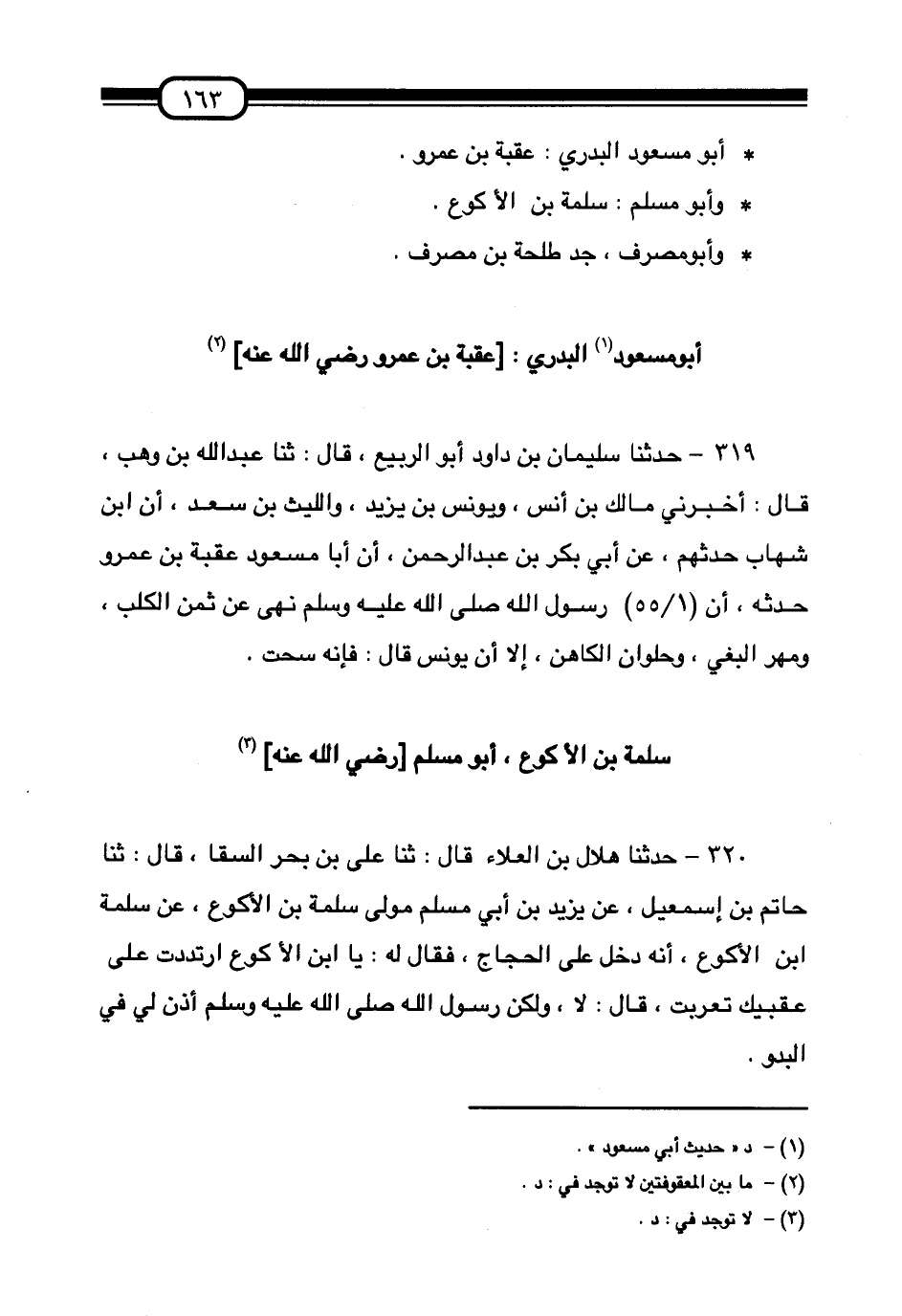 319 - حَدَّثَنَا سُلَيْمَانُ بْنُ دَاوُدَ أَبُو الرَّبِيعِ قَالَ:، ثَنَا عَبْدُ اللَّهِ بْنُ وَهْبٍ قَالَ: أَخْبَرَنِي مَالِكُ بْنُ أَنَسٍ وَيُونُسُ بْنُ يَزِيدَ وَاللَّيْثُ بْنُ سَعْدٍ أَنَّ ابْنَ شِهَابٍ حَدَّثَهُمْ , عَنْ أَبِي بَكْرِ بْنِ عَبْدِ الرَّحْمَنِ أَنَّ أَبَا مَسْعُودٍ عُقْبَةَ بْنَ عَمْرٍو حَدَّثَهُ: «أَنَّ رَسُولَ اللَّهِ صَلَّى اللهُ عَلَيْهِ وَسَلَّمَ §نَهَى عَنْ ثَمَنِ الْكَلْبِ وَمَهْرِ الْبَغِيِّ وَحُلْوَانِ الْكَاهِنِ» ، إِلَّا أَنَّ يُونُسَ قَالَ: فَإِنَّهُ سُحْتٌ