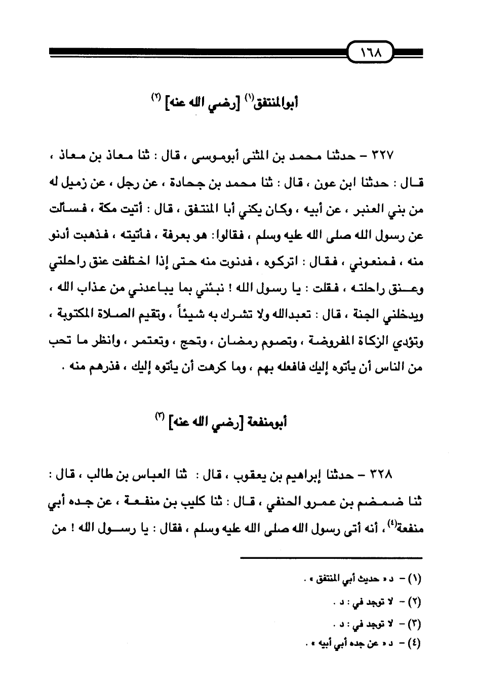 327 - حَدَّثَنَا مُحَمَّدُ بْنُ الْمُثَنَّى أَبُو مُوسَى قَالَ:، ثَنَا مُعَاذُ بْنُ مُعَاذٍ قَالَ: حَدَّثَنَا ابْنُ عَوْنٍ قَالَ:، ثَنَا مُحَمَّدُ بْنُ جُحَادَةَ عَنْ رَجُلٍ عَنْ زَمِيلٍ لَهُ مِنْ بَنِي الْعَنْبَرِ عَنْ أَبِيهِ وَكَانَ يُكْنَى أَبَا الْمُنْتَفِقِ قَالَ: أَتَيْتُ مَكَّةَ فَسَأَلْتُ عَنْ رَسُولِ اللَّهِ صَلَّى اللهُ عَلَيْهِ وَسَلَّمَ فَقَالُوا: هُوَ بِعَرَفَةَ. فَأَتَيْتُهُ فَذَهَبْتُ أَدْنُو مِنْهُ فَمَنَعُونِي فَقَالَ: «اتْرُكُوهُ» ، فَدَنَوْتُ مِنْهُ حَتَّى إِذَا اخْتَلَفَتْ عُنُقُ رَاحِلَتِي وَعُنُقُ رَاحِلَتِهِ فَقُلْتُ: يَا رَسُولَ اللَّهِ §نَبِّئْنِي بِمَا يُبَاعِدُنِي مِنْ عَذَابِ اللَّهِ وَيُدْخِلُنِي الْجَنَّةَ. قَالَ: «تَعْبُدُ اللَّهَ وَلَا تُشْرِكُ بِهِ شَيْئًا , وَتُقِيمُ الصَّلَاةَ الْمَكْتُوبَةَ , وَتُؤَدِّي الزَّكَاةَ الْمَفْرُوضَةَ , وَتَصُومُ رَمَضَانَ وَتَحُجُّ وَتَعْتَمِرُ , وَانْظُرْ مَا تُحِبُّ مِنَ النَّاسِ أَنْ يَأْتُوهُ إِلَيْكَ فَافْعَلْهُ بِهِمْ، وَمَا كَرِهْتَ أَنْ يَأْتُوهُ إِلَيْكَ فَذَرْهُمْ مِنْهُ»