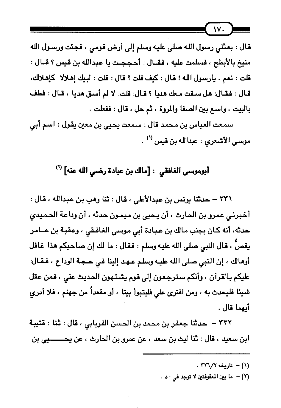 331 - حَدَّثَنَا يُونُسُ بْنُ عَبْدِ الْأَعْلَى قَالَ:، ثَنَا وَهْبُ بْنُ عَبْدِ اللَّهِ قَالَ: أَخْبَرَنِي عَمْرُو بْنُ الْحَارِثِ أَنَّ يَحْيَى بْنَ مَيْمُونٍ حَدَّثَهُ أَنَّ وَدَاعَةَ الْحُمَيْدِيَّ حَدَّثَهُ أَنَّهُ كَانَ بِجَنْبِ مَالِكِ بْنِ عُبَادَةَ أَبِي مُوسَى الْغَافِقِيِّ وَعُقْبَةُ بْنُ عَامِرٍ يَقُصُّ: قَالَ النَّبِيُّ صَلَّى اللهُ عَلَيْهِ وَسَلَّمَ، فَقَالَ مَالِكٌ: إِنَّ صَاحِبَكُمْ هَذَا غَافِلٌ أَوْ هَالِكٌ إِنَّ النَّبِيَّ صَلَّى اللهُ عَلَيْهِ وَسَلَّمَ عَهِدَ إِلَيْنَا فِي حَجَّةِ الْوَدَاعِ فَقَالَ: «§عَلَيْكُمْ بِالْقُرْآنِ , وَإِنَّكُمْ سَتَرْجِعُونَ إِلَى قَوْمٍ يَشْتَهُونَ الْحَدِيثَ عَنِّي، فَمَنْ عَقَلَ شَيْئًا فَلْيُحَدِّثْ بِهِ، وَمَنِ افْتَرَى عَلَيَّ فَلْيَتَبَوَّأْ بَيْتًا أَوْ مَقْعَدًا مِنْ جَهَنَّمَ» فَلَا أَدْرِي أَيَّهُمَا قَالَ