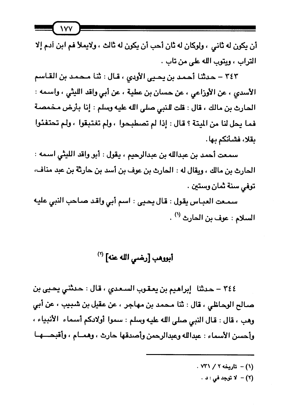 حَدَّثَنَا أَحْمَدُ بْنُ يَحْيَى الْأَوْدِيُّ قَالَ:، ثَنَا مُحَمَّدُ بْنُ الْقَاسِمِ الْأَسَدِيُّ عَنِ الْأَوْزَاعِيِّ، عَنْ حَسَّانَ بْنِ عَطِيَّةَ عَنْ أَبِي وَاقِدٍ اللَّيْثِيِّ وَاسْمُهُ الْحَارِثُ بْنُ مَالِكٍ قَالَ: قُلْتُ لِلنَّبِيِّ صَلَّى اللهُ عَلَيْهِ وَسَلَّمَ: إِنَّا بِأَرْضِ مَخْمَصَةٍ فَمَا يَحِلُّ لَنَا مِنَ الْمَيْتَةِ؟ قَالَ: «§إِذَا لَمْ تَصْطَبِحُوا وَلَمْ تَغْتَبِقُوا وَلَمْ تَحْتَفِئُوا بَقْلًا فَشَأْنُكُمْ بِهَا» . سَمِعْتُ أَحْمَدَ بْنَ عَبْدِ اللَّهِ بْنِ عَبْدِ الرَّحِيمِ، يَقُولُ: " أَبُو وَاقِدٍ اللَّيْثِيُّ اسْمُهُ: الْحَارِثُ بْنُ مَالِكٍ وَيُقَالُ لَهُ: الْحَارِثُ بْنُ عَوْفِ بْنِ أَسَدِ بْنِ حَارِثَةَ بْنِ عَبْدِ مَنَافٍ، تُوُفِّيَ سَنَةَ ثَمَانٍ وَسِتِّينَ ". سَمِعْتُ الْعَبَّاسَ يَقُولُ: قَالَ يَحْيَى: " اسْمُ أَبِي وَاقِدٍ صَاحِبِ النَّبِيِّ عَلَيْهِ السَّلَامُ: عَوْفُ بْنُ الْحَارِثِ "