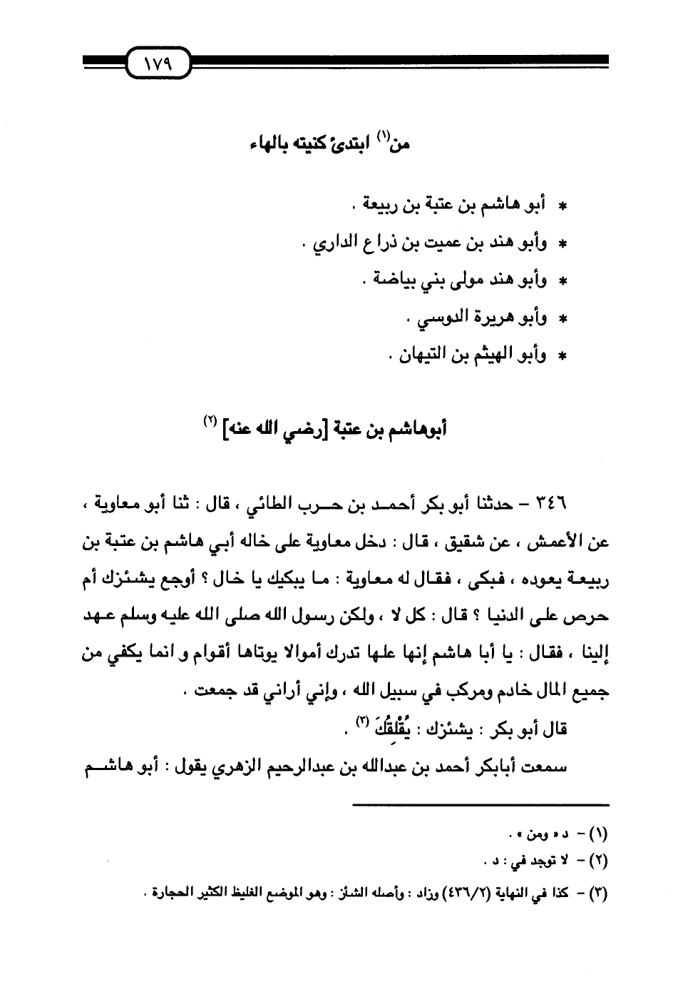 §مَنِ ابْتُدِئَ كُنْيَتُهُ بِالْهَاءِ أَبُو هَاشِمِ بْنُ عُتْبَةَ بْنِ رَبِيعَةَ. وَأُبُو هِنْدِ بْنُ عُمَيْتِ بْنِ ذِرَاعٍ الدَّارِيُّ. وَأَبُو هِنْدٍ مَوْلَى بَنِي بَيَاضَةَ. وَأَبُو هُرَيْرَةَ الدَّوْسِيُّ. وَأَبُو الْهَيْثَمِ بْنُ التَّيْهَانِ