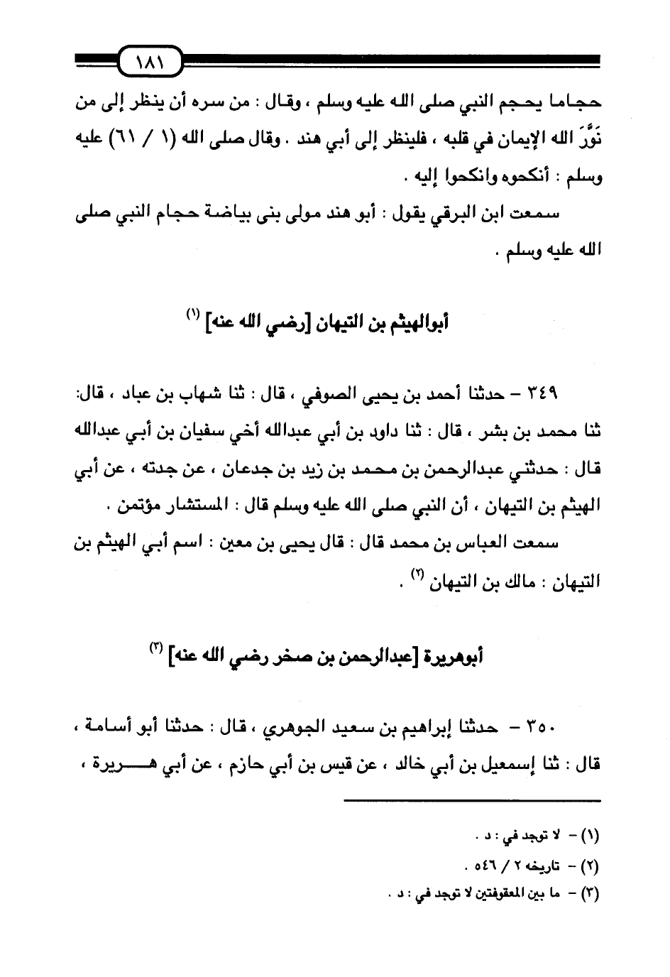 حَدَّثَنَا أَحْمَدُ بْنُ يَحْيَى الصُّوفِيُّ قَالَ:، ثَنَا شِهَابُ بْنُ عَبَّادٍ قَالَ:، ثَنَا مُحَمَّدُ بْنُ بِشْرٍ قَالَ:، ثَنَا دَاوُدُ بْنُ أَبِي عَبْدِ اللَّهِ أَخِي سُفْيَانَ بْنِ أَبِي عَبْدِ اللَّهِ قَالَ: حَدَّثَنِي عَبْدُ الرَّحْمَنِ بْنُ مُحَمَّدِ بْنِ زَيْدِ بْنِ جُدْعَانَ , عَنْ جَدَّتِهِ عَنْ أَبِي الْهَيْثَمِ بْنِ التَّيْهَانِ أَنَّ النَّبِيَّ صَلَّى اللهُ عَلَيْهِ وَسَلَّمَ قَالَ: «§الْمُسْتَشَارُ مُؤْتَمَنٌ» سَمِعْتُ الْعَبَّاسَ بْنَ مُحَمَّدٍ قَالَ: قَالَ يَحْيَى بْنُ مَعِينٍ: اسْمُ أَبِي الْهَيْثَمِ بْنِ التَّيْهَانِ: مَالِكُ بْنُ التَّيْهَانِ