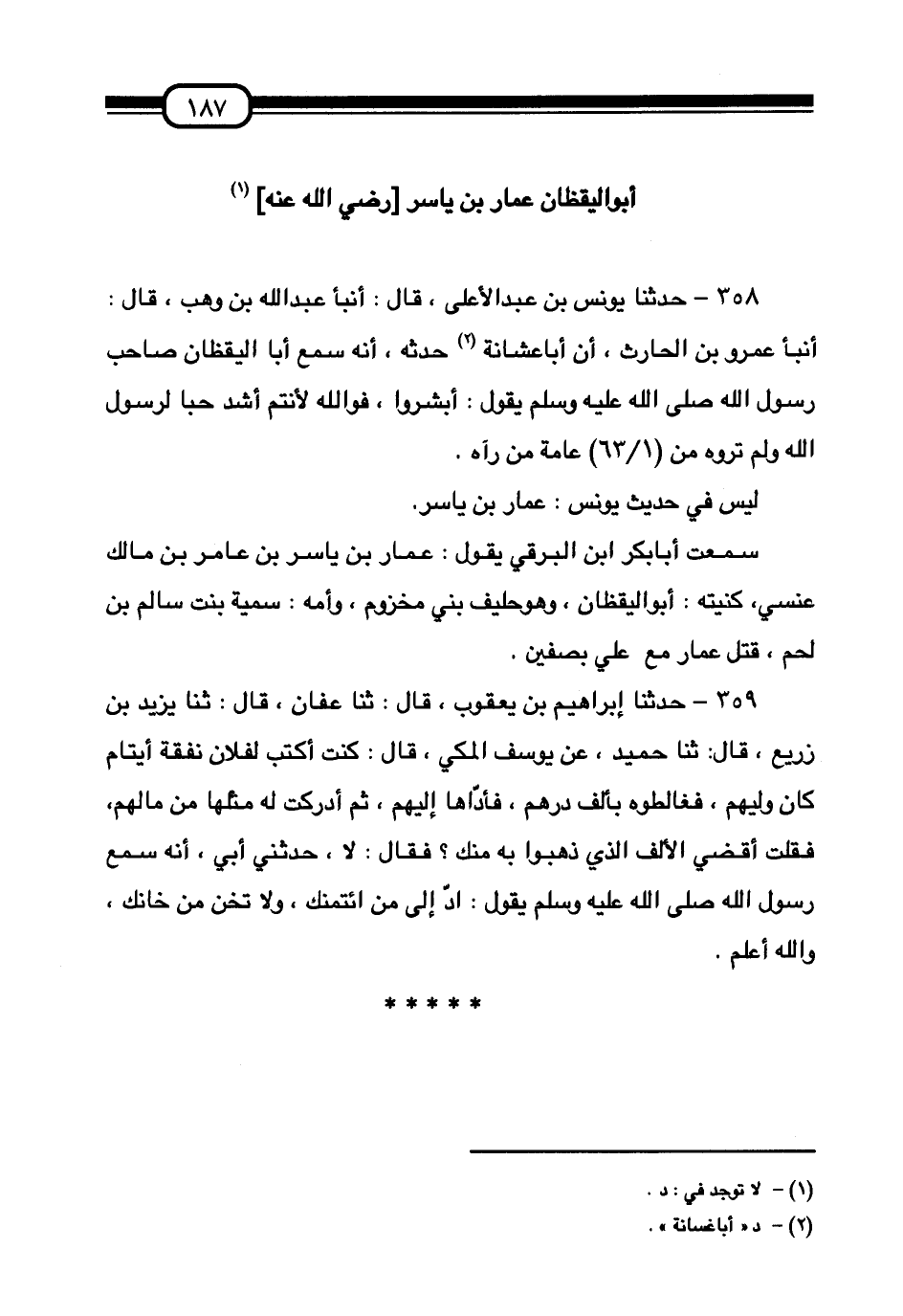 حَدَّثَنَا يُونُسُ بْنُ عَبْدِ الْأَعْلَى قَالَ أَنْبَأَ عَبْدُ اللهِ بْنِ وَهْبٍ قَالَ أَنْبَأَ عَمْرُو بْنُ الْحَارِثِ أَنَّ أَبَا عَشَانَةَ حَدَّثَهُ أَنَّهُ سَمِعَ أَبَا الْيَقْظَانِ صَاحِبَ رَسُولِ اللهِ صَلَّى اللهُ عَلَيْهِ وَسَلَّمَ يَقُولُ §أَبْشِرُوا فَوَاللهِ لَأَنْتُمْ أَشَدُّ حُبًّا لِرَسُولِ اللهِ وَلَمْ تَرَوْهُ مِنْ عَامَّةِ مَنْ رَآهُ لَيْسَ فِي حَدِيثِ يُونُسَ عَمَّارُ بْنُ يَاسِرٍ سَمِعْتُ أَبَا بَكْرِ بْنِ الْبَرْقِيِّ يَقُولُ عَمَّارُ بْنُ يَاسِرِ بْنِ عَامِرِ بْنِ مَالِكٍ عَنْسِيٌّ كُنْيَتُهُ أَبُو الْيَقْظَانِ وَهُوَ حَلِيفُ بَنِي مَخْزُومٍ وَأُمُّهُ سُمَيَّةُ بِنْتُ سَالِمِ بْنِ لَحْمٍ قُتِلَ عَمَّارٌ مَعَ عَلِيٍّ بِصِفِّينَ