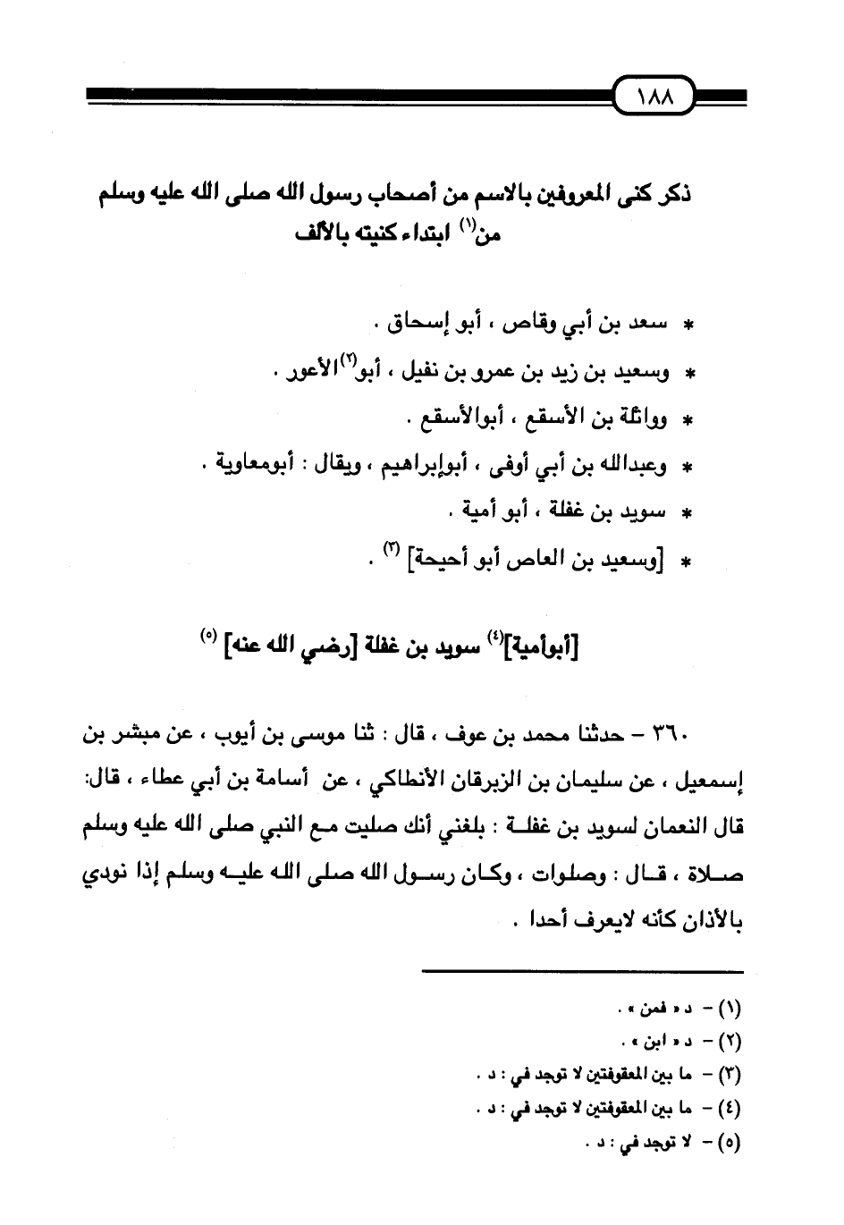 §مَنِ ابْتِدَاءُ كُنْيَتِهِ بِالْأَلِفِ سَعْدُ بْنُ أَبِي وَقَّاصٍ أَبُو إِسْحَاقَ. وَسَعِيدُ بْنُ زَيْدِ بْنِ عَمْرِو بْنِ نُفَيْلٍ أَبُو الْأَعْوَرِ. وَوَاثِلَةُ بْنُ الْأَسْقَعِ أَبُو الْأَسْقَعِ. وَعَبْدُ اللَّهِ بْنُ أَبِي أَوْفَى أَبُو إِبْرَاهِيمَ وَيُقَالُ: أَبُو مُعَاوِيَةَ. سُوَيْدُ بْنُ غَفَلَةَ أَبُو أُمَيَّةَ. وَسَعِيدُ بْنُ الْعَاصِ أَبُو أُحَيْحَةَ