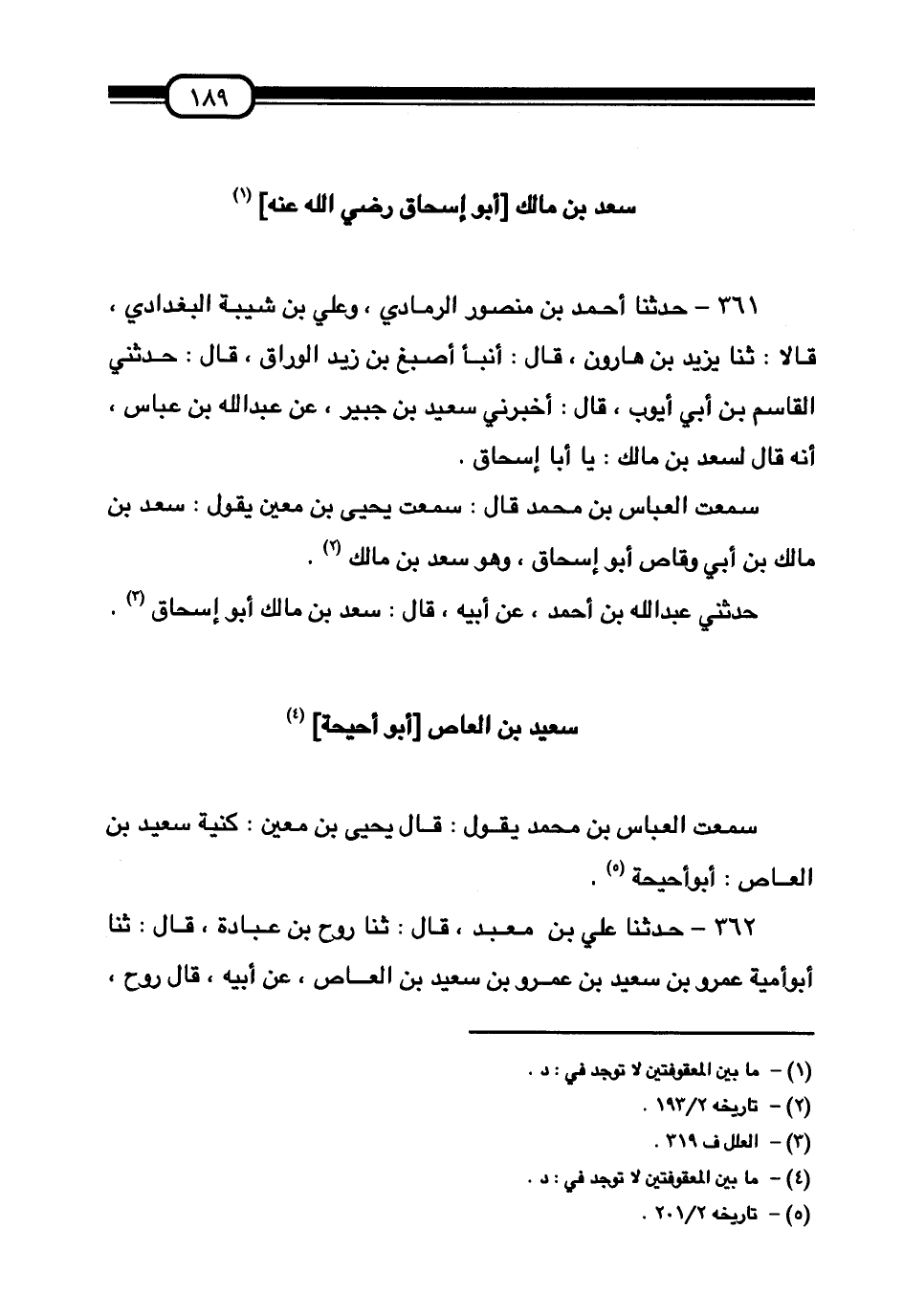حَدَّثَنَا عَلِيُّ بْنُ مَعْبَدٍ قَالَ:، ثَنَا رَوْحُ بْنُ عُبَادَةَ قَالَ:، ثَنَا أَبُو أُمَيَّةَ عَمْرُو بْنُ سَعِيدِ بْنِ عَمْرِو بْنِ سَعِيدِ بْنِ الْعَاصِ، عَنْ أَبِيهِ - قَالَ رَوْحٌ -[190]-: عَنْ جَدِّهِ فِيمَا أَحْسَبُ - «أَنَّ النَّبِيَّ صَلَّى اللهُ عَلَيْهِ وَسَلَّمَ §عَادَ أَبَا أُحَيْحَةَ فِي مَرَضِهِ مَرَّتَيْنِ، وَكَانَ مَاتَ مُشْرِكًا»