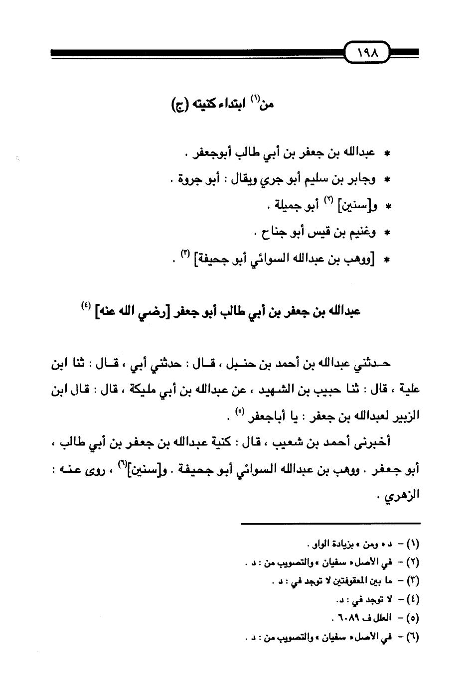 §عَبْدُ اللَّهِ بْنُ جَعْفَرِ بْنِ أَبِي طَالِبٍ أَبُو جَعْفَرٍ رَضِيَ اللَّهُ عَنْهُ حَدَّثَنِي عَبْدُ اللَّهِ بْنُ أَحْمَدَ بْنِ حَنْبَلٍ قَالَ: حَدَّثَنِي أَبِي قَالَ: ثنا ابْنُ عُلَيَّةَ قَالَ: ثنا حَبِيبُ بْنُ الشَّهِيدِ، عَنْ عَبْدِ اللَّهِ بْنِ أَبِي مُلَيْكَةَ قَالَ: قَالَ ابْنُ الزُّبَيْرِ لِعَبْدِ اللَّهِ بْنِ جَعْفَرٍ: يَا أَبَا جَعْفَرٍ. أَخْبَرَنِي أَحْمَدُ بْنُ شُعَيْبٍ قَالَ: كُنْيَةُ عَبْدِ اللَّهِ بْنِ جَعْفَرِ بْنِ أَبِي طَالِبٍ أَبُو جَعْفَرٍ. وَوَهْبُ بْنُ عَبْدِ اللَّهِ السُّوَائِيُّ أَبُو جُحَيْفَةَ. وَسُنَيْنٌ رَوَىَ عَنْهُ الزُّهْرِيُّ