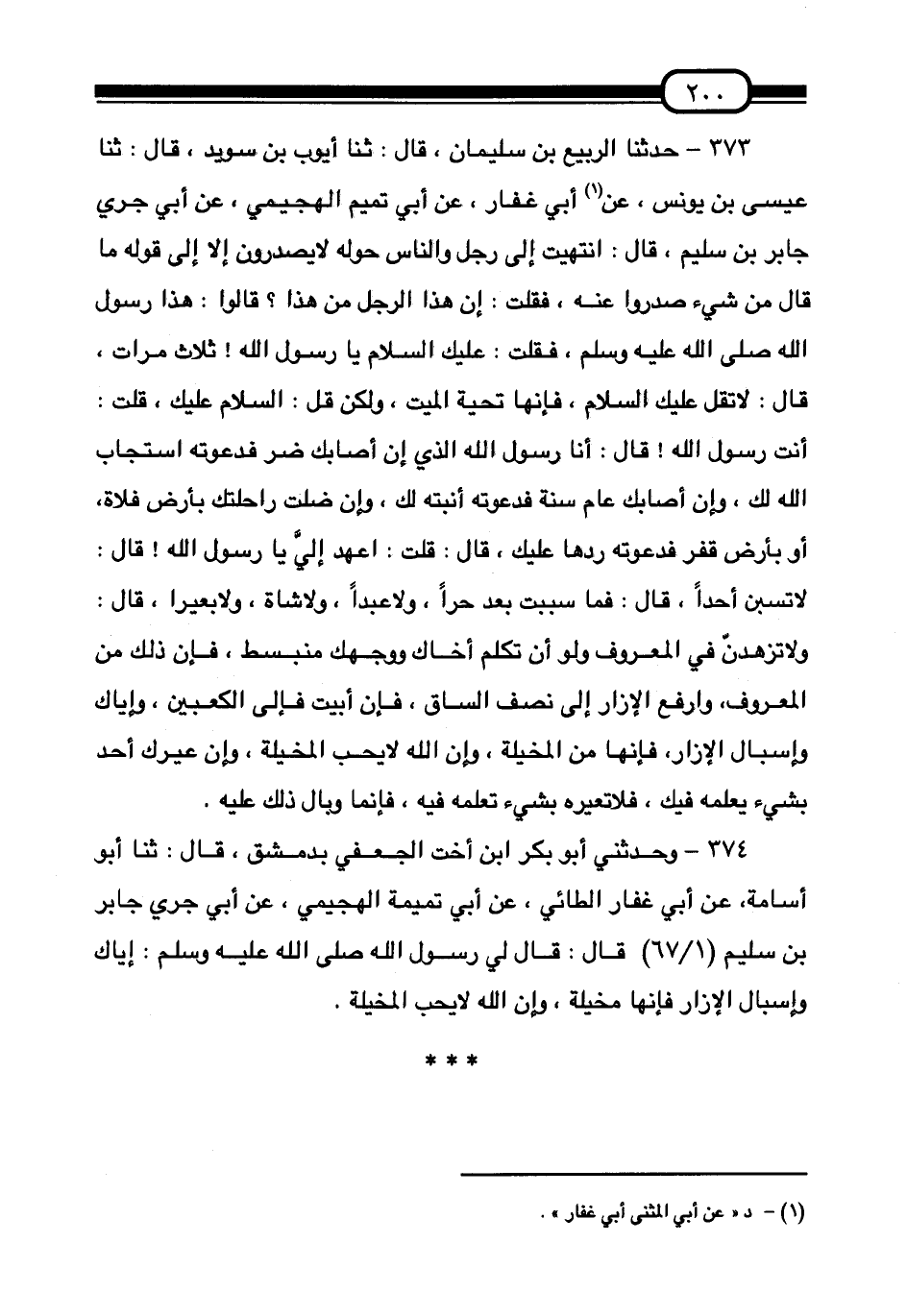 374 - وَحَدَّثَنِي أَبُو بَكْرِ ابْنُ أُخْتِ الْجُعْفِيِّ بِدِمَشْقَ قَالَ:، ثَنَا أَبُو أُسَامَةَ، عَنْ أَبِي غِفَارٍ الطَّائِيِّ، عَنْ أَبِي تَمِيمَةَ الْهُجَيْمِيِّ عَنْ أَبِي جُرَيٍّ جَابِرِ بْنِ سُلَيْمٍ قَالَ: قَالَ لِي رَسُولُ اللَّهِ صَلَّى اللهُ عَلَيْهِ وَسَلَّمَ: «§إِيَّاكَ وَإِسْبَالَ الْإِزَارِ؛ فَإِنَّهَا مَخِيلَةٌ , وَإِنَّ اللَّهَ لَا يُحِبُّ الْمَخِيلَةَ»