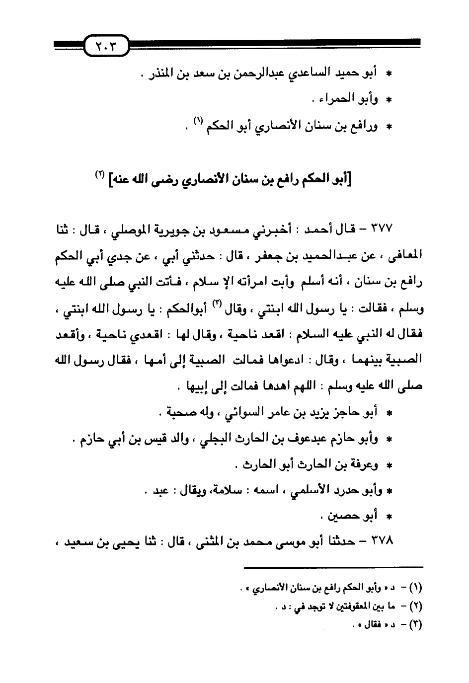 377 - قَالَ أَحْمَدُ: أَخْبَرَنِي مَسْعُودُ بْنُ جُوَيْرِيَةَ الْمَوْصِلِيُّ قَالَ:، ثَنَا الْمُعَافَى، عَنْ عَبْدِ الْحَمِيدِ بْنِ جَعْفَرٍ قَالَ: حَدَّثَنِي أَبِي عَنْ جَدِّي أَبِي الْحَكَمِ رَافِعِ بْنِ سِنَانٍ: أَنَّهَ §أَسْلَمَ وَأَبَتِ امْرَأَتُهُ الْإِسْلَامَ فَأَتَتِ النَّبِيَّ صَلَّى اللهُ عَلَيْهِ وَسَلَّمَ فَقَالَتْ يَا رَسُولَ اللَّهِ ابْنَتِي، وَقَالَ أَبُو الْحَكَمِ يَا رَسُولَ اللَّهِ ابْنَتِي، فَقَالَ لَهُ النَّبِيُّ عَلَيْهِ السَّلَامُ: «اقْعُدْ نَاحِيَةً» ، وَقَالَ لَهَا: «اقْعُدِي نَاحِيَةً» ، وَأَقْعَدَ الصَّبِيَّةَ بَيْنَهُمَا، وَقَالَ: «ادْعُوَاهَا» فَمَالَتِ الصَّبِيَّةُ إِلَى أُمِّهَا فَقَالَ رَسُولُ اللَّهِ صَلَّى اللهُ عَلَيْهِ وَسَلَّمَ: «اللَّهُمَّ اهْدِهَا» فَمَالَتْ إِلَى أَبِيهَا. أَبُو حَاجِزٍ يَزِيدُ بْنُ عَامِرٍ السُّوَائِيُّ وَلَهُ صُحْبَةٌ. وَأَبُو حَازِمٍ عَبْدُ عَوْفِ بْنِ الْحَارِثِ الْبَجَلِيُّ وَالِدُ قَيْسِ بْنِ أَبِي حَازِمٍ. وَعَرَفَةُ بْنُ الْحَارِثِ أَبُو الْحَارِثِ. وَأَبُو حَدْرَدٍ الْأَسْلَمِيُّ اسْمُهُ سَلَامَةُ وَيُقَالُ: عَبْدٌ. أَبُو حُصَيْنٍ