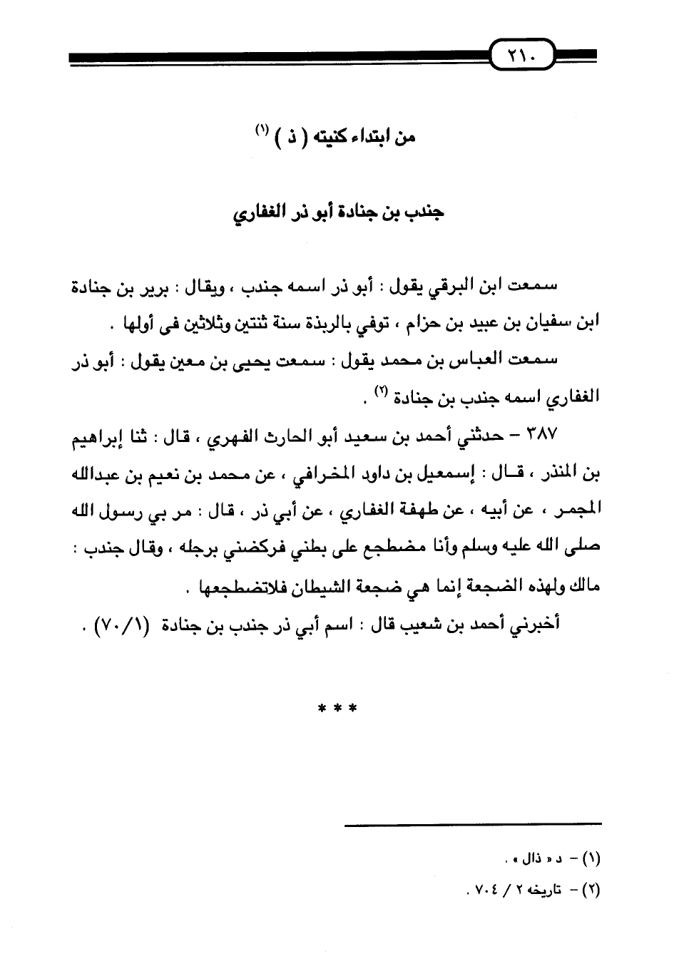 §جُنْدُبُ بْنُ جُنَادَةَ أَبُو ذَرٍّ الْغِفَارِيُّ سَمِعْتُ ابْنَ الْبَرْقِيِّ يَقُولُ: أَبُو ذَرٍّ اسْمُهُ جُنْدُبٌ وَيُقَالُ: بَرِيرُ بْنُ جُنَادَةَ بْنِ سُفْيَانَ بْنِ عُبَيْدِ بْنِ حِزَامٍ، تُوُفِّيَ بِالرَّبَذَةِ سَنَةَ اثْنَتَيْنِ وَثَلَاثِينَ فِي أَوَّلِهَا. سَمِعْتُ الْعَبَّاسَ بْنَ مُحَمَّدٍ يَقُولُ: سَمِعْتُ يَحْيَى بْنَ مَعِينٍ يَقُولُ: أَبُو ذَرٍّ الْغِفَارِيُّ اسْمُهُ جُنْدُبُ بْنُ جُنَادَةَ.