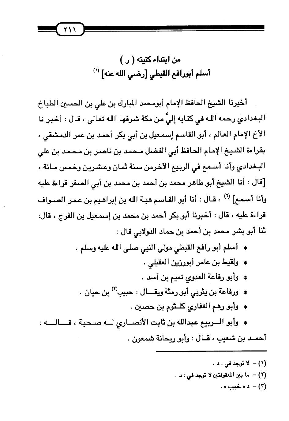 §أَسْلَمُ أَبُو رَافِعٍ الْقِبْطِيُّ رَضِيَ اللَّهُ عَنْهُ أَخْبَرَنَا الشَّيْخُ الْحَافِظُ الْإِمَامُ أَبُو مُحَمَّدٍ الْمُبَارَكُ بْنُ عَلِيِّ بْنِ الْحُسَيْنِ الطَّبَّاخُ الْبَغْدَادِيُّ رَحِمَهُ اللَّهُ فِي كِتَابِهِ إِلَيَّ مِنْ مَكَّةَ شَرَّفَهَا اللَّهُ تَعَالَى، قَالَ: أَخْبَرَنَا الْأَخُ الْإِمَامُ الْعَالِمُ أَبُو الْقَاسِمِ إِسْمَاعِيلُ بْنُ أَبِي بَكْرٍ أَحْمَدَ بْنِ عُمَرَ الدِّمَشْقِيُّ، بِقِرَاءَةِ الشَّيْخِ الْإِمَامِ الْحَافِظِ أَبِي الْفَضْلِ مُحَمَّدِ بْنِ نَاصِرِ بْنِ مُحَمَّدِ بْنِ عَلِيٍّ الْبَغْدَادِيِّ وَأَنَا أَسْمَعُ فِي الرَّبِيعِ الْآخِرِ مِنْ سَنَةِ ثَمَانٍ وَعِشْرِينَ وَخَمْسِمِائَةٍ قَالَ: أنا الشَّيْخُ أَبُو طَاهِرٍ مُحَمَّدُ بْنُ أَحْمَدَ بْنِ مُحَمَّدِ بْنِ أَبِي الصَّفَرِ قِرَاءَةً عَلَيْهِ وَأَنَا أَسْمَعُ، قَالَ: أنا أَبُو الْقَاسِمِ هِبَةُ اللَّهِ بْنُ إِبْرَاهِيمَ بْنِ عُمَرَ الصَّوَّافُ قِرَاءَةً عَلَيْهِ، قَالَ: أَخْبَرَنَا أَبُو بَكْرٍ أَحْمَدُ بْنُ مُحَمَّدِ بْنِ إِسْمَاعِيلَ بْنِ الْفَرَجِ قَالَ: ثنا أَبُو بِشْرٍ مُحَمَّدُ بْنُ أَحْمَدَ بْنِ حَمَّادٍ الدُّولَابِيُّ قَالَ: أَسْلَمُ أَبُو رَافِعٍ الْقِبْطِيُّ مَوْلَى النَّبِيِّ صَلَّى اللهُ عَلَيْهِ وَسَلَّمَ. وَلَقِيطُ بْنُ عَامِرٍ أَبُو رَزِينٍ الْعَقِيلِيُّ. وَأَبُو رِفَاعَةَ الْعَدَوِيُّ تَمِيمُ بْنُ أَسَدٍ. وَرِفَاعَةُ بْنُ يَثْرِبِيٍّ أَبُو رِمْثَةَ وَيُقَالُ: حَبِيبُ بْنُ حَيَّانَ. وَأَبُو رُهْمٍ الْغِفَارِيُّ كُلْثُومُ بْنُ حُصَيْنٍ. وَأَبُو الرَّبِيعِ عَبْدُ اللَّهِ بْنُ ثَابِتٍ الْأَنْصَارِيُّ لَهُ صُحْبَةٌ، قَالَهُ: أَحْمَدُ بْنُ شُعَيْبٍ قَالَ: وَأَبُو رَيْحَانَةَ شَمْعُونُ