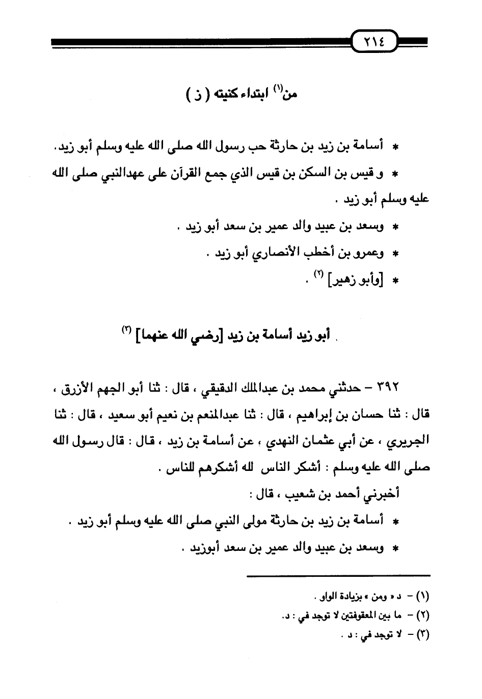 §مَنِ ابْتِدَاءُ كُنْيَتِهِ (ز) أُسَامَةُ بْنُ زَيْدِ بْنِ حَارِثَةَ حِبُّ رَسُولِ اللَّهِ صَلَّى اللهُ عَلَيْهِ وَسَلَّمَ أَبُو زَيْدٍ. وَقَيْسُ بْنُ السَّكَنِ بْنِ قَيْسٍ الَّذِي جَمَعَ الْقُرْآنَ عَلَى عَهْدِ النَّبِيِّ صَلَّى اللهُ عَلَيْهِ وَسَلَّمَ أَبُو زَيْدٍ. وَسَعْدُ بْنُ عُبَيْدٍ وَالِدُ عُمَيْرِ بْنِ سَعْدٍ أَبُو زَيْدٍ. وَعَمْرُو بْنُ أَخْطَبَ الْأَنْصَارِيُّ أَبُو زَيْدٍ. وَأَبُو زُهَيْرٍ