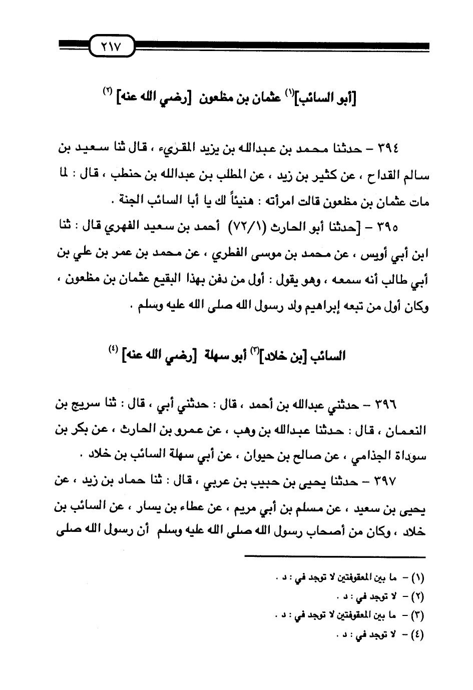394 - حَدَّثَنَا مُحَمَّدُ بْنُ عَبْدِ اللَّهِ بْنِ يَزِيدَ الْمُقْرِئُ قَالَ:، ثَنَا سَعِيدُ بْنُ سَالِمٍ الْقَدَّاحُ , عَنْ كَثِيرِ بْنِ زَيْدٍ عَنِ الْمُطَّلِبِ بْنِ عَبْدِ اللَّهِ بْنِ حَنْطَبٍ قَالَ: " §لَمَّا مَاتَ عُثْمَانُ بْنُ مَظْعُونٍ قَالَتِ امْرَأَتُهُ: هَنِيئًا لَكَ يَا أَبَا السَّائِبِ، الْجَنَّةُ "