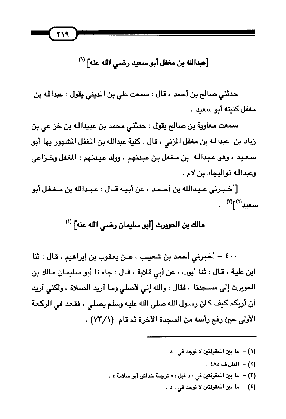 §عَبْدُ اللَّهِ بْنُ مُغَفَّلٍ أَبُو سَعِيدٍ رَضِيَ اللَّهُ عَنْهُ حَدَّثَنِي صَالِحُ بْنُ أَحْمَدَ، قَالَ: سَمِعْتُ عَلِيَّ بْنَ الْمَدِينِيِّ يَقُولُ: عَبْدُ اللَّهِ بْنُ مُغَفَّلٍ كُنْيَتُهُ أَبُو سَعِيدٍ. سَمِعْتُ مُعَاوِيَةَ بْنَ صَالِحٍ يَقُولُ: حَدَّثَنِي مُحَمَّدُ بْنُ عُبَيْدِ اللَّهِ بْنِ خُزَاعِيِّ بْنِ زِيَادِ بْنِ عَبْدِ اللَّهِ بْنِ مُغَفَّلٍ الْمُزَنِيُّ، قَالَ: كُنْيَةُ عَبْدِ اللَّهِ بْنِ الْمُغَفَّلِ الْمَشْهُورُ بِهَا أَبُو سَعِيدٍ، وَهُوَ عَبْدُ اللَّهِ بْنُ مُغَفَّلِ بْنِ عَبْدِ نهمٍ، وَوَلَدُ عَبْدِ نهمٍ: الْمُغَفَّلُ، وَخُزَاعِيٌّ، وَعَبْدُ اللَّهِ ذُو الْبِجَادِ بْنُ لَامٍ. أَخْبَرَنِي عَبْدُ اللَّهِ بْنُ أَحْمَدَ، عَنْ أَبِيهِ قَالَ: عَبْدُ اللَّهِ بْنُ مُغَفَّلٍ: أَبُو سَعِيدٍ