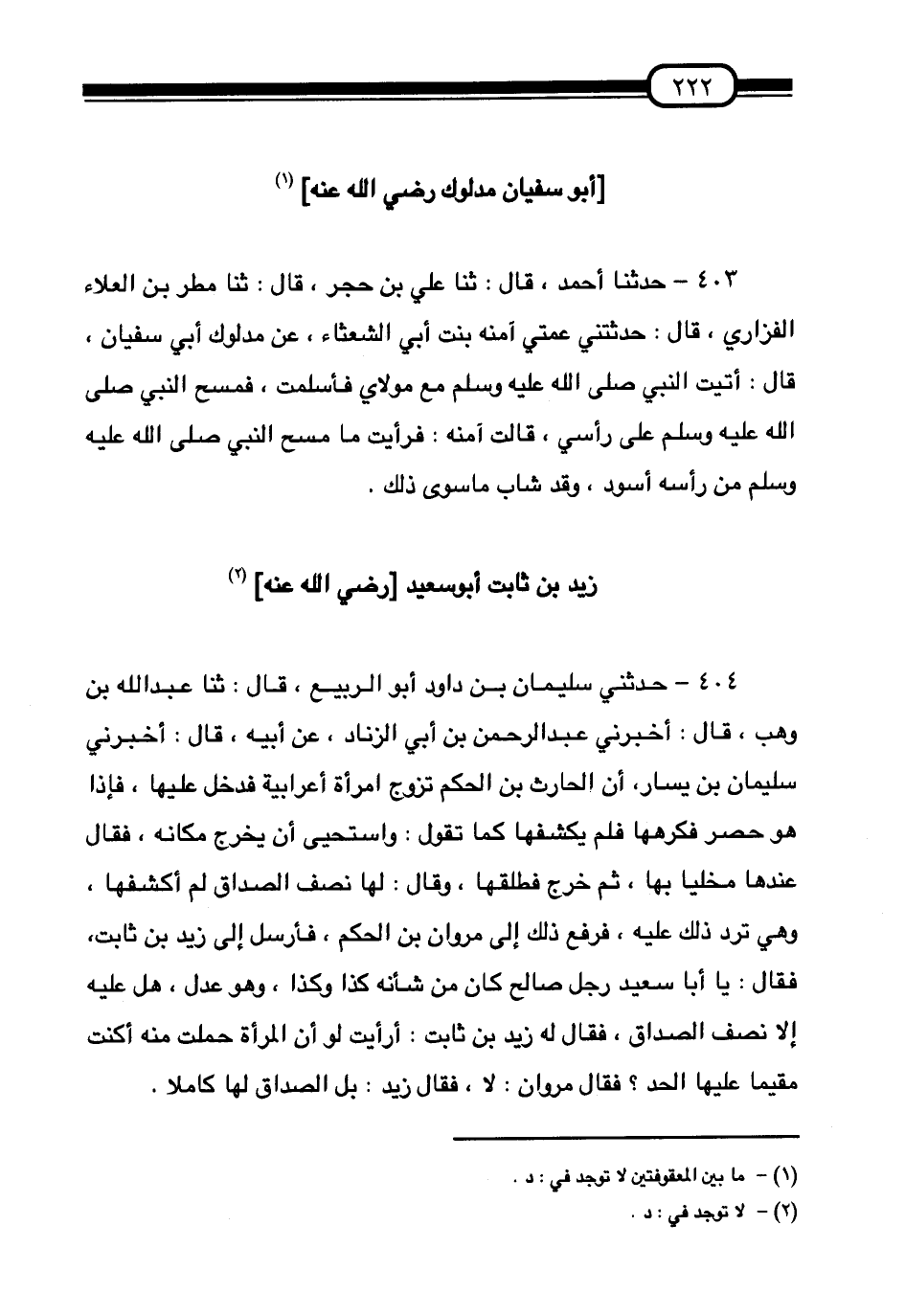 404 - حَدَّثَنِي سُلَيْمَانُ بْنُ دَاوُدَ أَبُو الرَّبِيعِ قَالَ، ثنا عَبْدُ اللَّهِ بْنُ وَهْبٍ قَالَ أَخْبَرَنِي عَبْدُ الرَّحْمَنِ بْنُ أَبِي الزِّنَادِ، عَنْ أَبِيهِ قَالَ: أَخْبَرَنِي سُلَيْمَانُ بْنُ يَسَارٍ أَنَّ الْحَارِثَ بْنَ الْحَكَمِ §تَزَوَّجَ امْرَأَةً أَعْرَابِيَّةً فَدَخَلَ عَلَيْهَا فَإِذَا هُوَ حَصِرٌ فَكَرِهَهَا فَلَمْ يَكْشِفْهَا كَمَا تَقُولُ وَاسْتَحْيَا أَنْ يَخْرُجَ مَكَانَهُ فَقَالَ عِنْدَهَا مُخَلِّيًا بِهَا ثُمَّ خَرَجَ فَطَلَّقَهَا وَقَالَ: لَهَا نِصْفُ الصَّدَاقِ لَمْ أَكْشِفْهَا وَهِيَ تَرُدُّ ذَلِكَ عَلَيْهِ فَرَفَعَ ذَلِكَ إِلَى مَرْوَانَ بْنِ الْحَكَمِ فَأَرْسَلَ إِلَى زَيْدِ بْنِ ثَابِتٍ فَقَالَ: يَا أَبَا سَعِيدٍ , رَجُلٌ صَالِحٌ كَانَ مِنْ شَأْنِهِ كَذَا، وَكَذَا وَهُوَ عَدْلٌ هَلْ عَلَيْهِ إِلَّا نِصْفُ الصَّدَاقِ؟ فَقَالَ لَهُ زَيْدُ بْنُ ثَابِتٍ: أَرَأَيْتَ لَوْ أَنَّ الْمَرْأَةَ حَمَلَتْ مِنْهُ أَكُنْتَ مُقِيمًا عَلَيْهَا الْحَدَّ؟ فَقَالَ مَرْوَانُ: , لَا , فَقَالَ زَيْدٌ: بَلِ الصَّدَاقُ لَهَا كَامِلًا -[223]-. سَمِعْتُ عَبْدَ اللَّهِ بْنَ أَحْمَدَ، عَنْ أَبِيهِ قَالَ: ثنا حُسَيْنُ بْنُ مُحَمَّدٍ، قَالَ: ثنا أَبُو مَعْشَرٍ، عَنْ عَبْدِ اللَّهِ بْنِ نَافِعٍ قَالَ: سُئِلَ زَيْدُ بْنُ ثَابِتٍ، فَقِيلَ لَهُ يَا أَبَا سَعِيدٍ. قَالَ عَبْدُ اللَّهِ، قَالَ أَبِي: «وَيُرْوَى فِي حَدِيثٍ آخَرَ، قِيلَ لَهُ يَا أَبَا خَارِجَةَ»