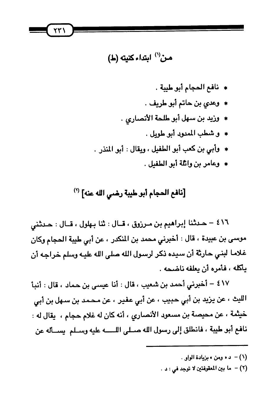 §مَنِ ابْتِدَاءُ كُنْيَتِهِ (ط) نَافِعٌ الْحَجَّامُ أَبُو طَيْبَةَ. وَعَدِيُّ بْنُ حَاتِمٍ أَبُو طَرِيفٍ. وَزَيْدُ بْنُ سَهْلٍ أَبُو طَلْحَةَ الْأَنْصَارِيُّ. وَشَطْبٌ الْمَمْدُودُ أَبُو طَوِيلٍ. وَأُبَيُّ بْنُ كَعْبٍ أَبُو الطُّفَيْلِ وَيُقَالُ: أَبُو الْمُنْذِرِ. وَعَامِرُ بْنُ وَاثِلَةَ أَبُو الطُّفَيْلِ.