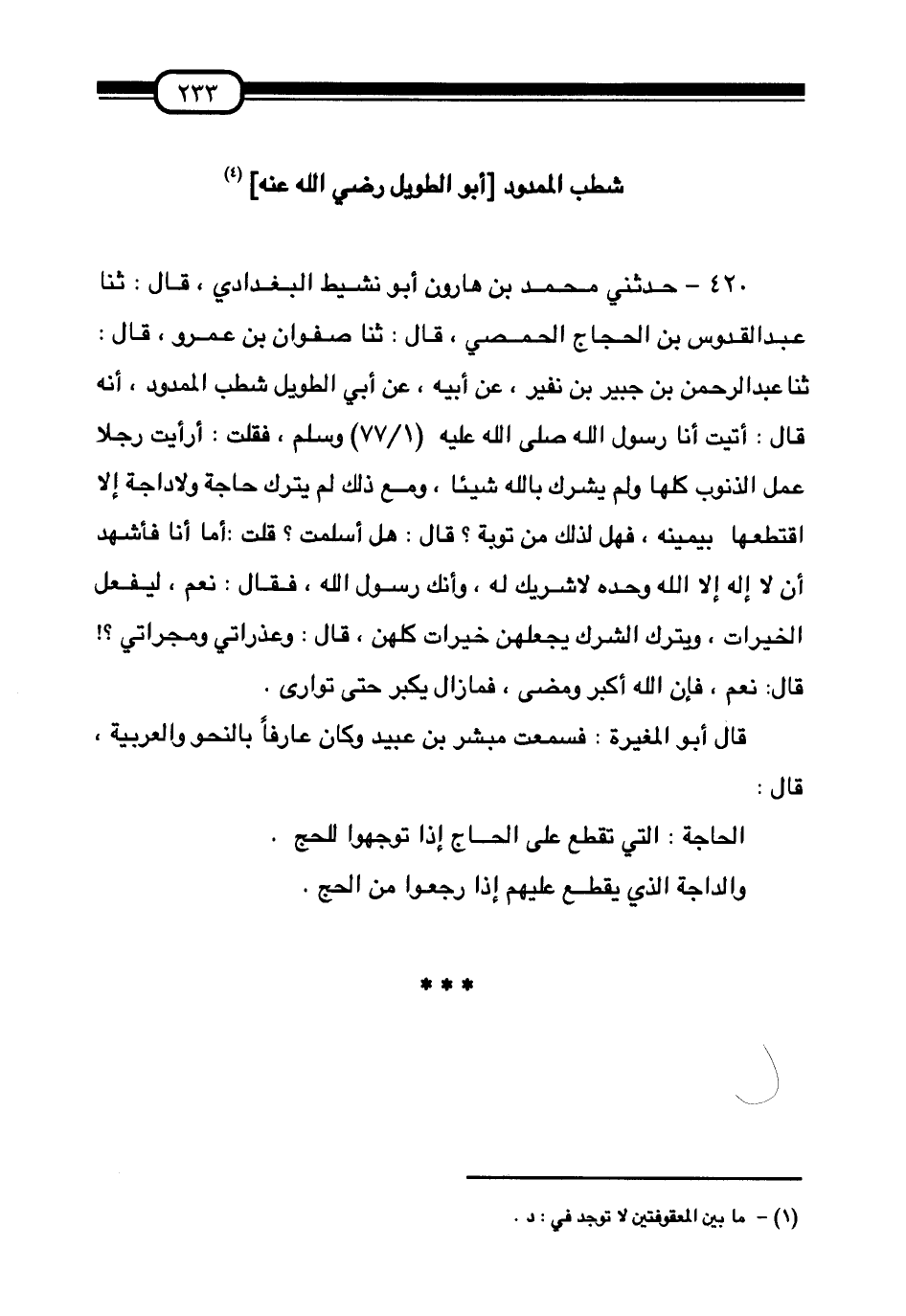 420 - حَدَّثَنِي مُحَمَّدُ بْنُ هَارُونَ أَبُو نَشِيطٍ الْبَغْدَادِيُّ قَالَ:، ثَنَا عَبْدُ الْقُدُّوسِ بْنُ الْحَجَّاجِ الْحِمْصِيُّ قَالَ:، ثَنَا صَفْوَانُ بْنُ عَمْرٍو قَالَ:، ثَنَا عَبْدُ الرَّحْمَنِ بْنُ جُبَيْرِ بْنِ نُفَيْرٍ، عَنْ أَبِيهِ عَنْ أَبِي الطَّوِيلِ شَطْبٍ الْمَمْدُودِ أَنَّهُ قَالَ: أَتَيْتُ أَنَا رَسُولَ اللَّهِ صَلَّى اللهُ عَلَيْهِ وَسَلَّمَ فَقُلْتُ: §أَرَأَيْتَ رَجُلًا عَمِلَ الذُّنُوبَ كُلَّهَا وَلَمْ يُشْرِكْ بِاللَّهِ شَيْئًا وَمَعَ ذَلِكَ لَمْ يَتْرُكْ حَاجَةً وَلَا دَاجَةً إِلَّا اقْتَطَعَهَا بِيَمِينِهِ فَهَلْ لِذَلِكَ مِنْ تَوْبَةٍ قَالَ: «هَلْ أَسْلَمْتَ» ؟ قُلْتُ: أَمَّا أَنَا فَأَشْهَدُ أَنْ لَا إِلَهَ إِلَّا اللَّهُ وَحْدَهُ لَا شَرِيكَ لَهُ وَأَنَّكَ رَسُولُ اللَّهِ. فَقَالَ: «نَعَمْ لِيَفْعَلِ الْخَيْرَاتِ وَيَتْرُكِ الشِّرْكَ، يَجْعَلُهُنَّ خَيْرَاتٍ كُلَّهُنَّ» . قَالَ: وَعُذْرَاتِي وَمُجْرَاتِي؟ قَالَ: «نَعَمْ فَإِنَّ اللَّهَ أَكْبَرُ» وَمَضَى فَمَا زَالَ يُكَبِّرُ حَتَّى تَوَارَى قَالَ أَبُو الْمُغِيرَةِ: فَسَمِعْتُ مُبَشِّرَ بْنَ عُبَيْدٍ وَكَانَ عَارَفًا بِالنِّحْوِ وَالْعَرَبِيَّةِ قَالَ: الْحَاجَةُ الَّتِي تَقْطَعُ عَلَى الْحَاجِّ إِذَا تَوَجَّهُوَا لِلْحَجِّ , وَالدَّاجَةُ الَّذِي يَقْطَعُ عَلَيْهِمْ إِذَا رَجَعُوا مِنَ الْحَجِّ
